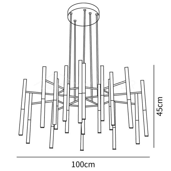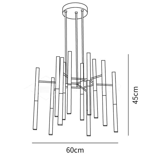 A striking yet refined centerpiece, this chandelier offers a clean design that complements tailored rooms. Its repeating shapes evoke the silhouette of a modern sculpture, with slender metal rods elegantly arranged across a sleek crossbar. Ideal for modern spaces, the chandelier’s straight contours align with architectural lines, providing a multi-directional glow that creates a bright, inviting atmosphere.