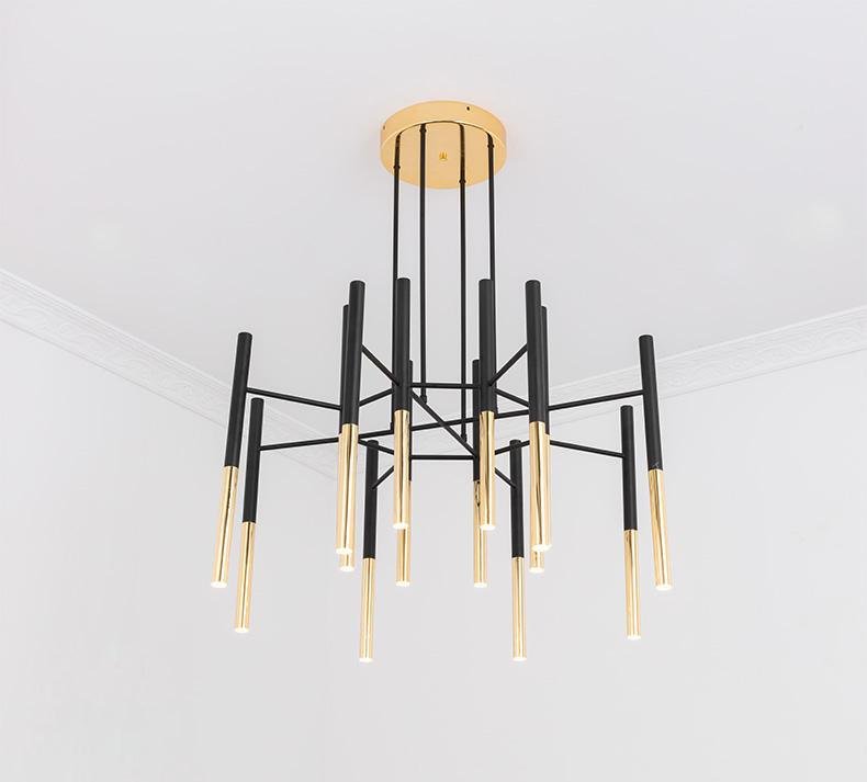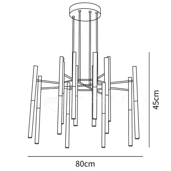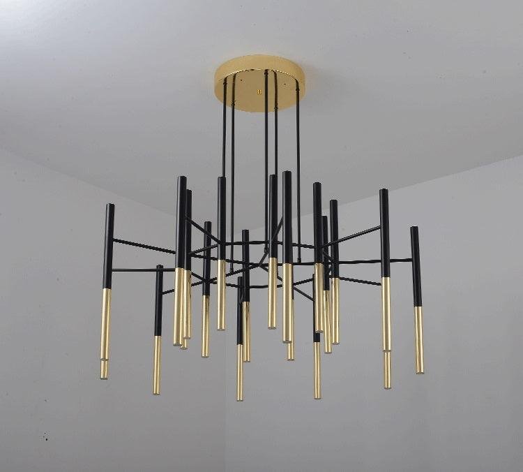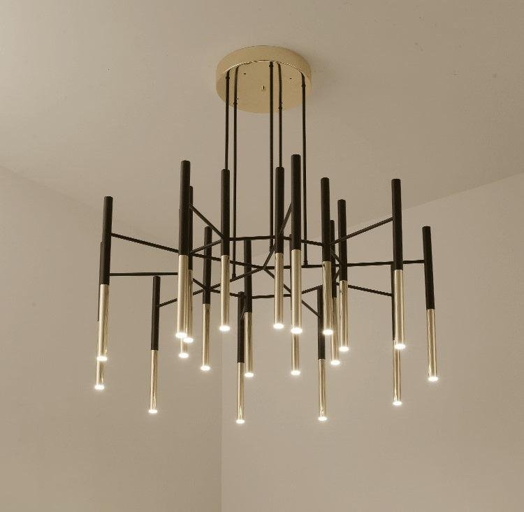 A striking yet refined centerpiece, this chandelier offers a clean design that complements tailored rooms. Its repeating shapes evoke the silhouette of a modern sculpture, with slender metal rods elegantly arranged across a sleek crossbar. Ideal for modern spaces, the chandelier’s straight contours align with architectural lines, providing a multi-directional glow that creates a bright, inviting atmosphere.