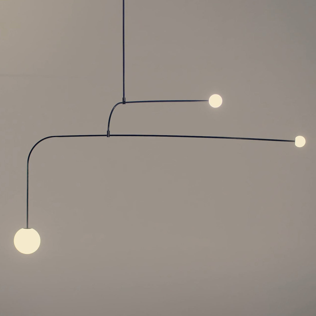 This lighting fixture features a minimalist design characterized by graphic and uncluttered forms. The structure utilizes clean lines to suspend multiple warm light sources, featuring diffusers crafted from opaline-blown glass for soft light distribution.