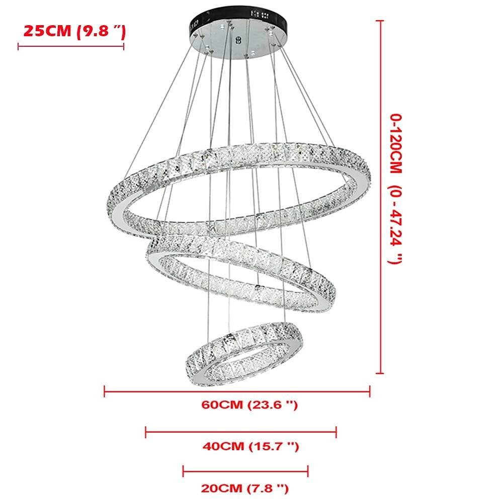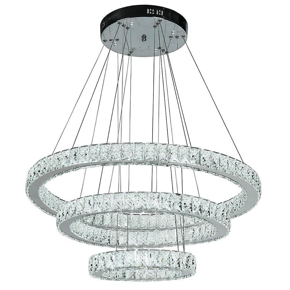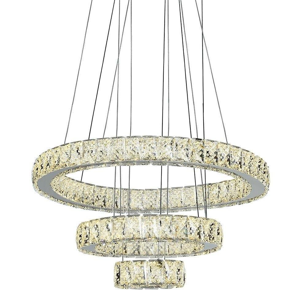 This 3-Tier Circles Suspended Chandelier features three descending circles, each adorned with finely cut crystals. The rings are suspended from a ceiling canopy via a cord. A sleek chrome finish enhances the metal structure, with each element electroplated for a polished appearance.