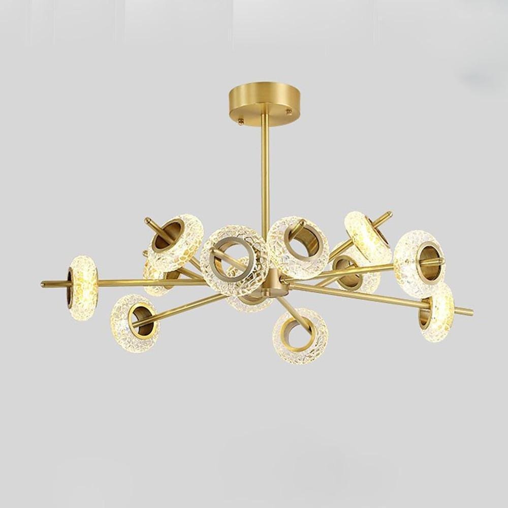 This modern LED chandelier features an intricate design with a brass fixture and crystal light body. Its structure consists of smooth, metallic rings that connect and branch out from a central point, reminiscent of a delicate mobile. Each ring is adorned with finely cut, irregular crystal shapes, hand-polished to reflect and refract light. These crystals add a tactile variety to the smooth metal, making it suitable for living rooms and bedrooms.