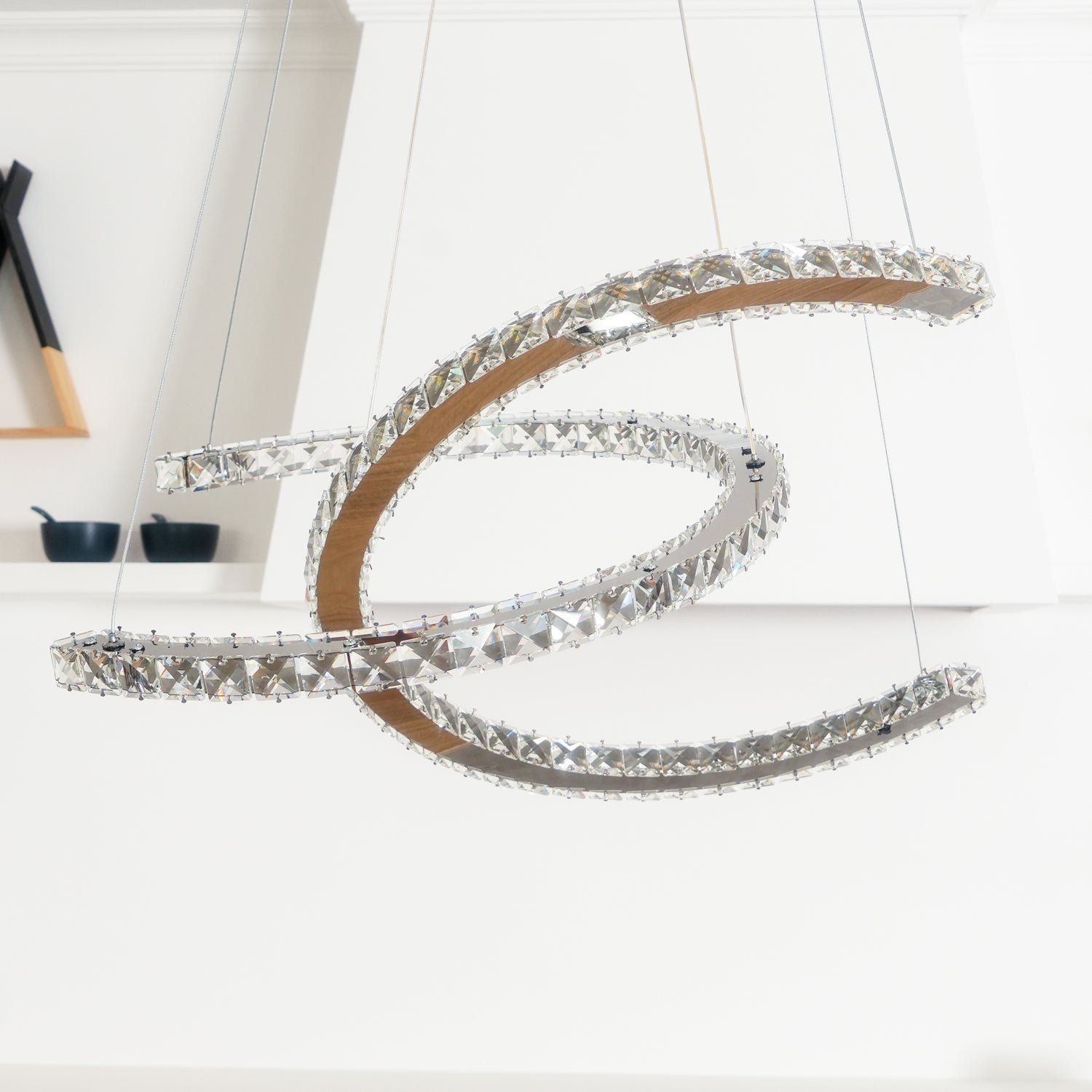 This modern chandelier features a contemporary design, ideal for enhancing living rooms or bedrooms. The fixture is crafted from silver stainless steel, meticulously embedded with genuine K9 crystals to provide intricate detailing.