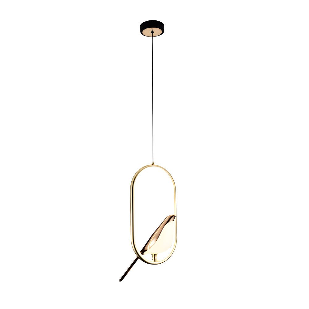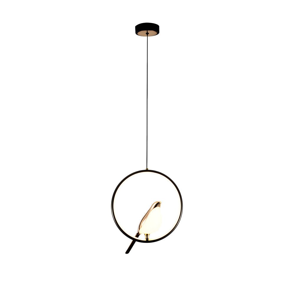 - Inspired by the elegance of the magpie bird, the Magpie Pendant Light combines sleek design with functionality, offering a refined lighting solution for contemporary interiors. It is crafted with aluminum and soft silicone, designed to resemble a magpie standing on a circular or oval metal ring. Its sleek form and electroplated finish, available in both gold and black, enhance any interior space, including dining rooms, kitchen islands, living rooms, and bedrooms.