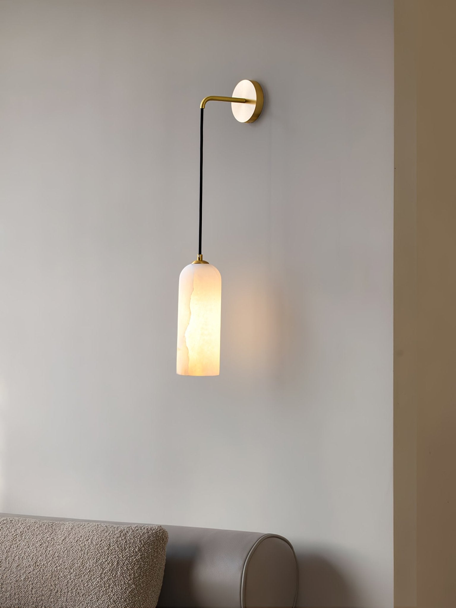 The Monty Wall Lamp features a distinctive Alabaster shade, reflecting a Modern aesthetic. It serves as an accent in various spaces, such as illuminating a kitchen island or providing ambient light when grouped in a foyer. The lamp includes a braided cord.