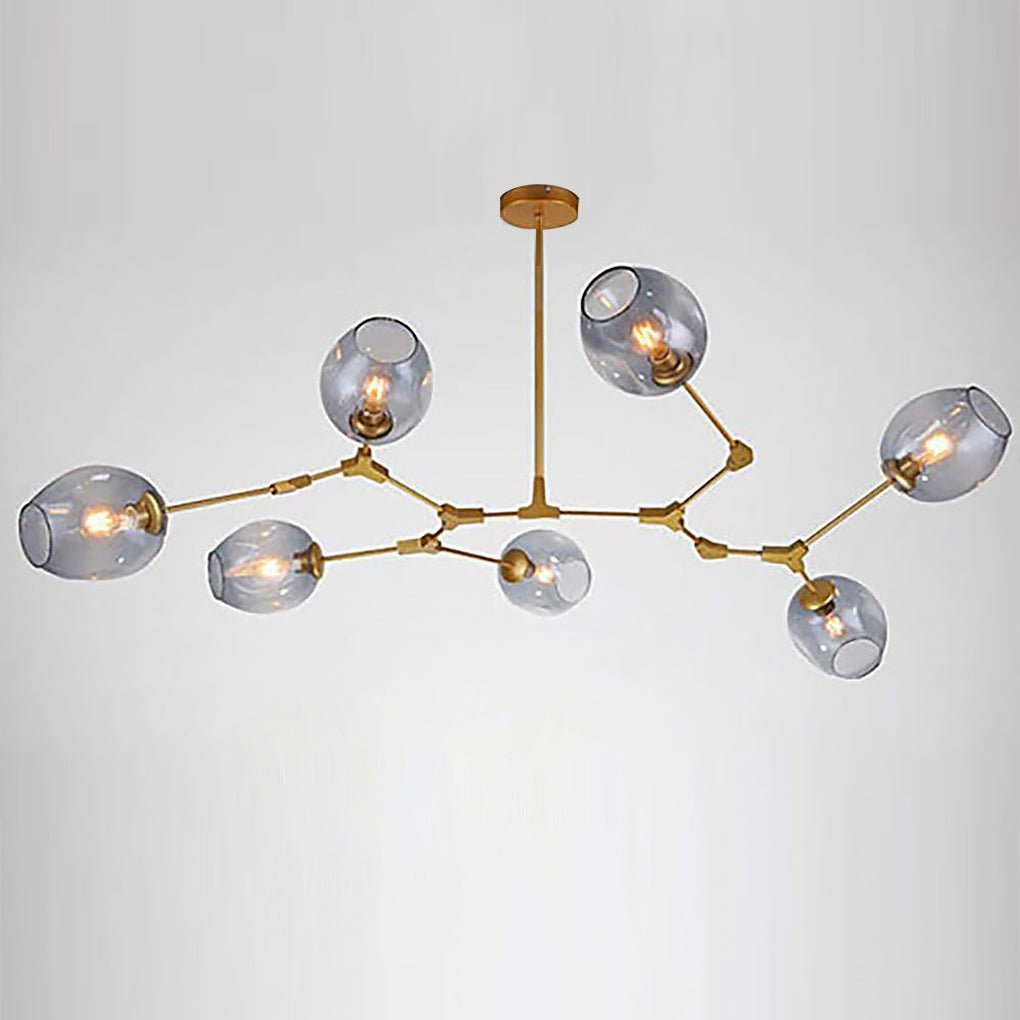 This Bubble Sputnik Chandelier features a structure reminiscent of a delicate tree branch or a molecular model. Several arms extend from a central hub. The lamp body arms are crafted from metal with a smooth, polished golden finish. Each arm terminates in a round, smooth bulb, enclosed by an elliptical clear glass shade. This Bubble Sputnik Chandelier blends the feeling of organic growth with the precise symmetry of scientific models.