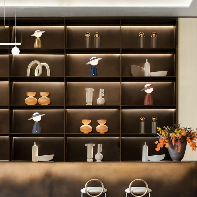 This Nordic touch-control accent table lamp, featuring a unique Scarecrow style, offers balanced and diffused illumination. Its global shade design includes an adjustable hat component, allowing for directional control of the LED light.