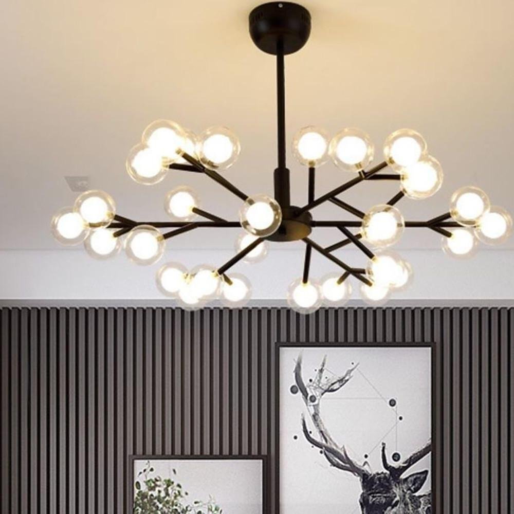 The Iron Acrylic Bubble Chandelier features a distinctive design. It is a Sputnik Sphere pendant light constructed from high-quality materials. The chandelier’s body is finished in a gold frame, designed to reflect light. Suspended from the ceiling, the chandelier’s acrylic gradient grey glass globe bubble shade comprises multiple curvilinear elements, evoking the image of delicate leaves.