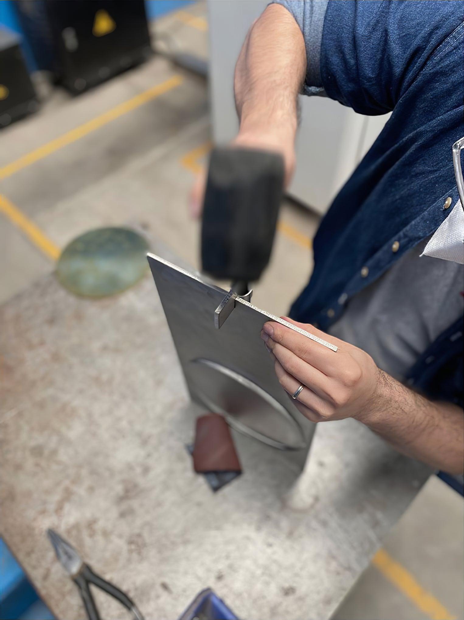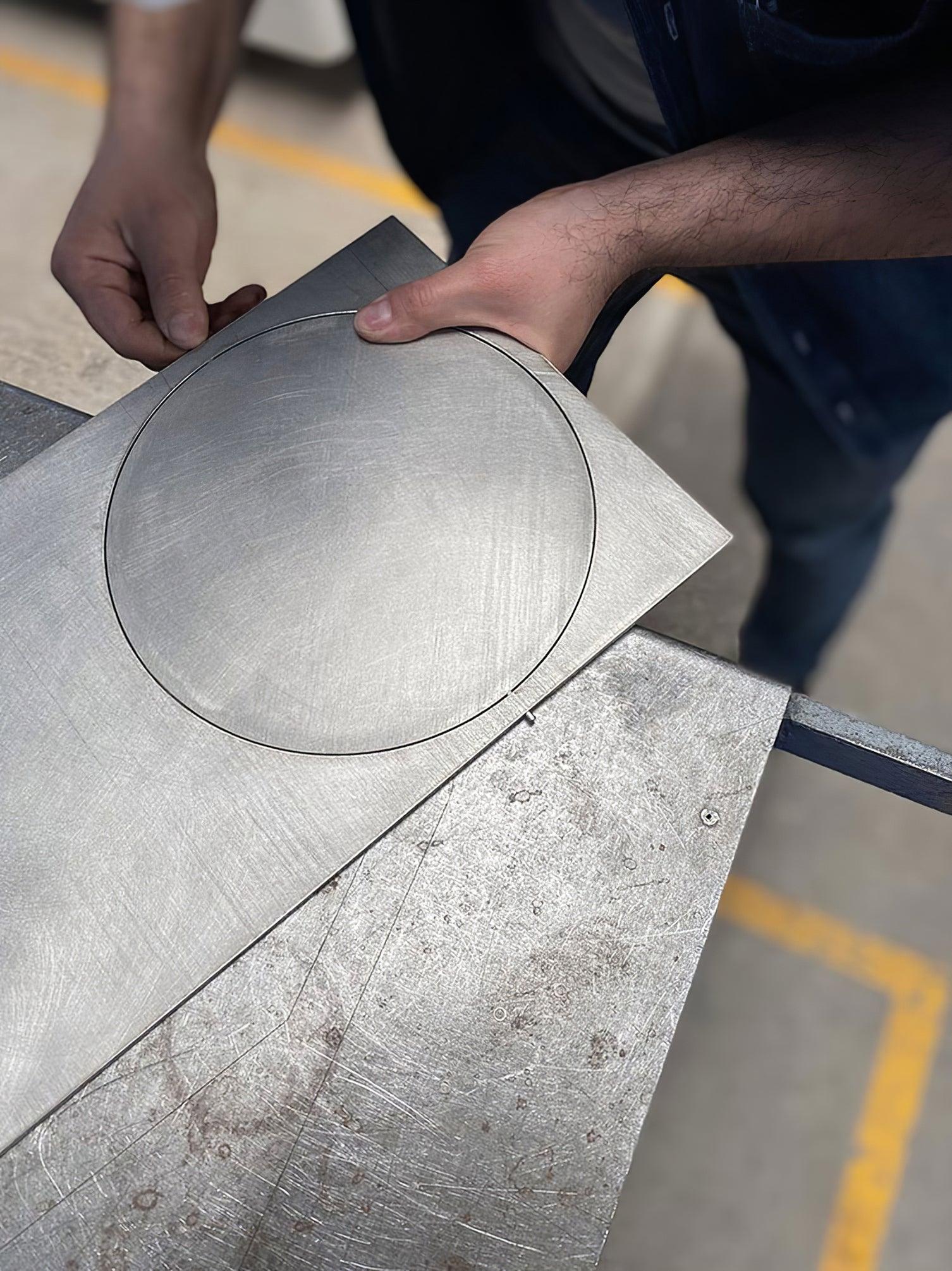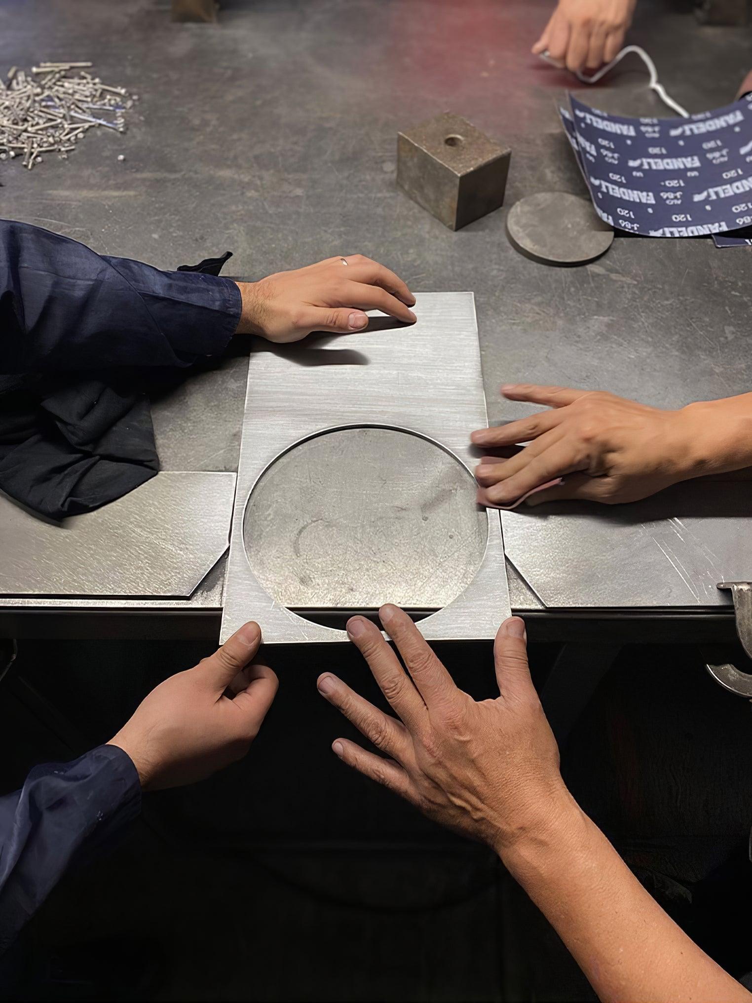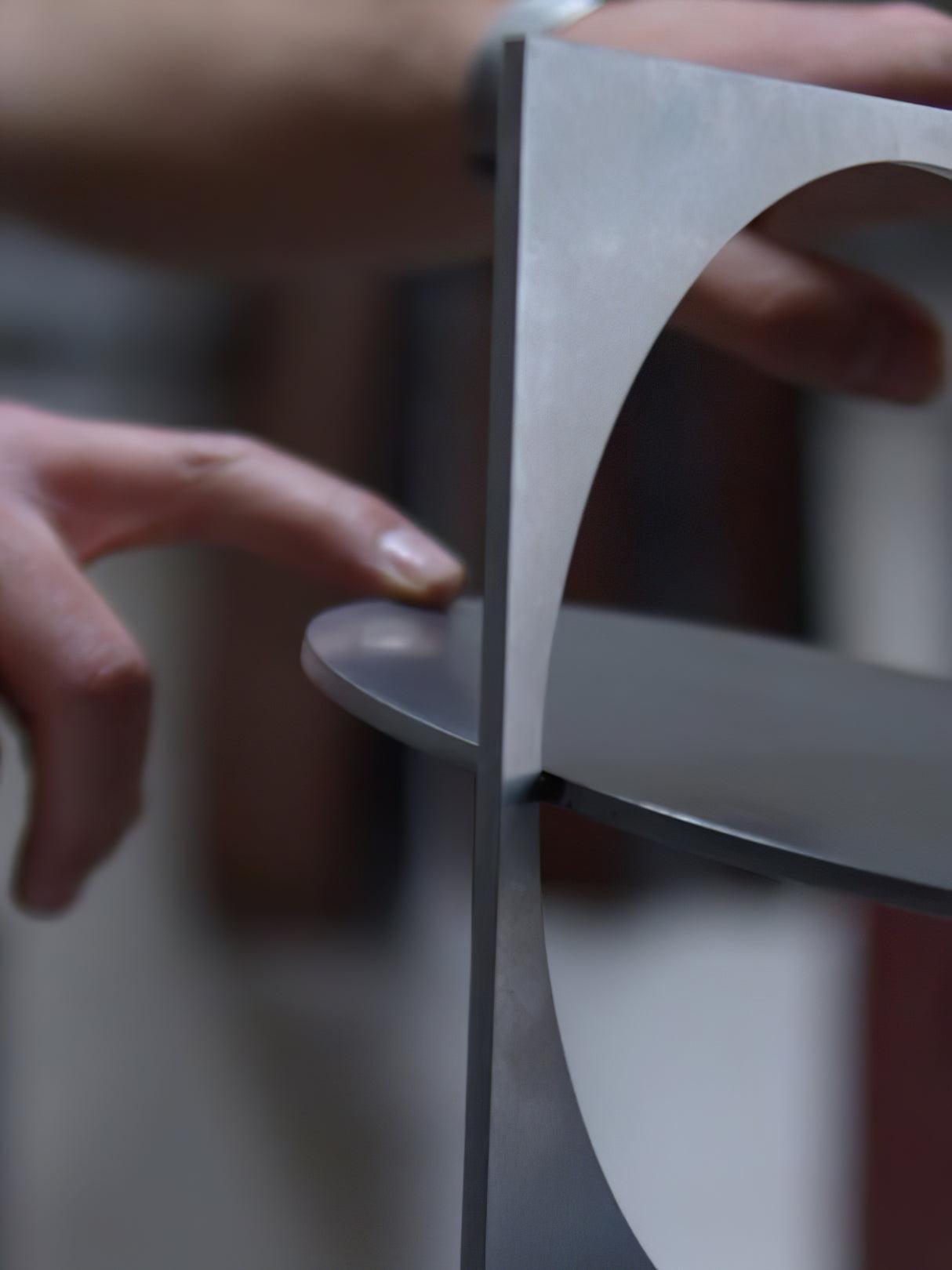 The OBJ-01 table lamp features an intuitive and clear design, immediately revealing its material, manufacturing process, function, and application. It is crafted from a raw metal plate, precisely laser-cut and hand-assembled without welding, utilizing a rubber hammer for its joinery. The lamp’s dimensions adhere to standard material modulation and commercial formats. Pure geometric figures form the lighting fixture: a rectangle, a circle, and a cylindrical element at the back housing the integrated LED light spot. The cut-out circle functions as a rotatable screen, allowing 360-degree adjustment to direct light as desired.