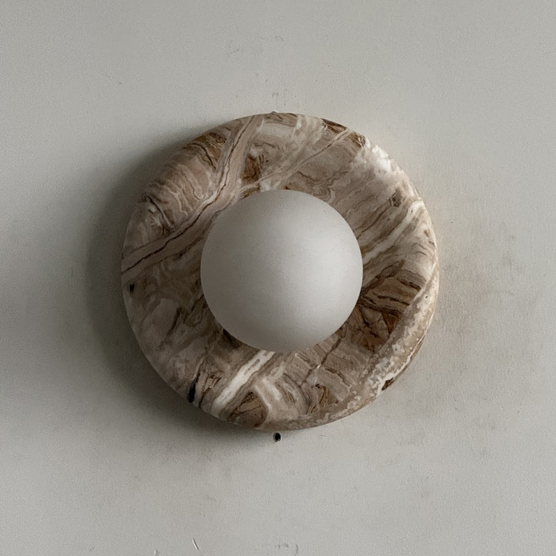 The Beige Marble Sconce masterfully merges contemporary style with classic elegance. Featuring a perfectly round form and a central glass globe set against a curved marble backplate, it adds a sophisticated touch to any space. Ideal for enhancing the ambiance in hallways, living rooms, or bedrooms, this wall light illuminates with a soft, layered glow.