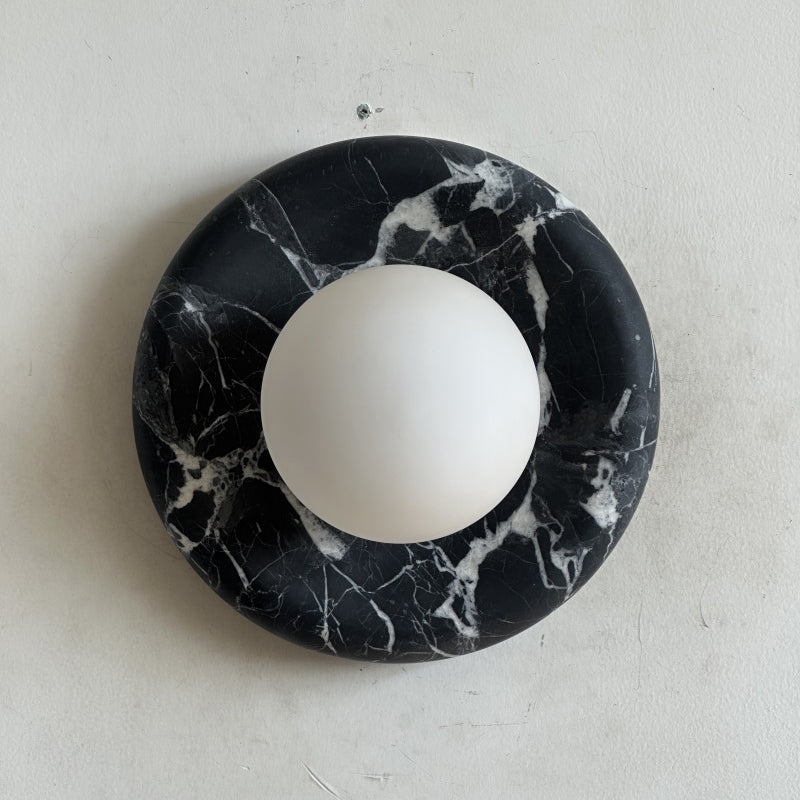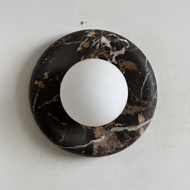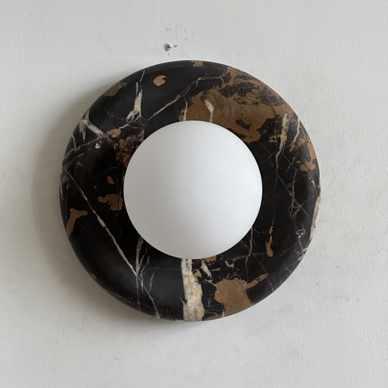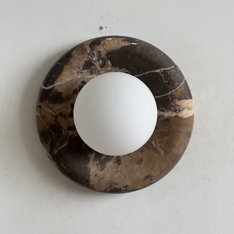 The wall lamp masterfully merges contemporary style with classic elegance. Featuring a perfectly round form and a central glass globe set against a curved marble backplate, it adds a sophisticated touch to any space. Ideal for enhancing the ambiance in hallways, living rooms, or bedrooms, this wall light illuminates with a soft, layered glow.