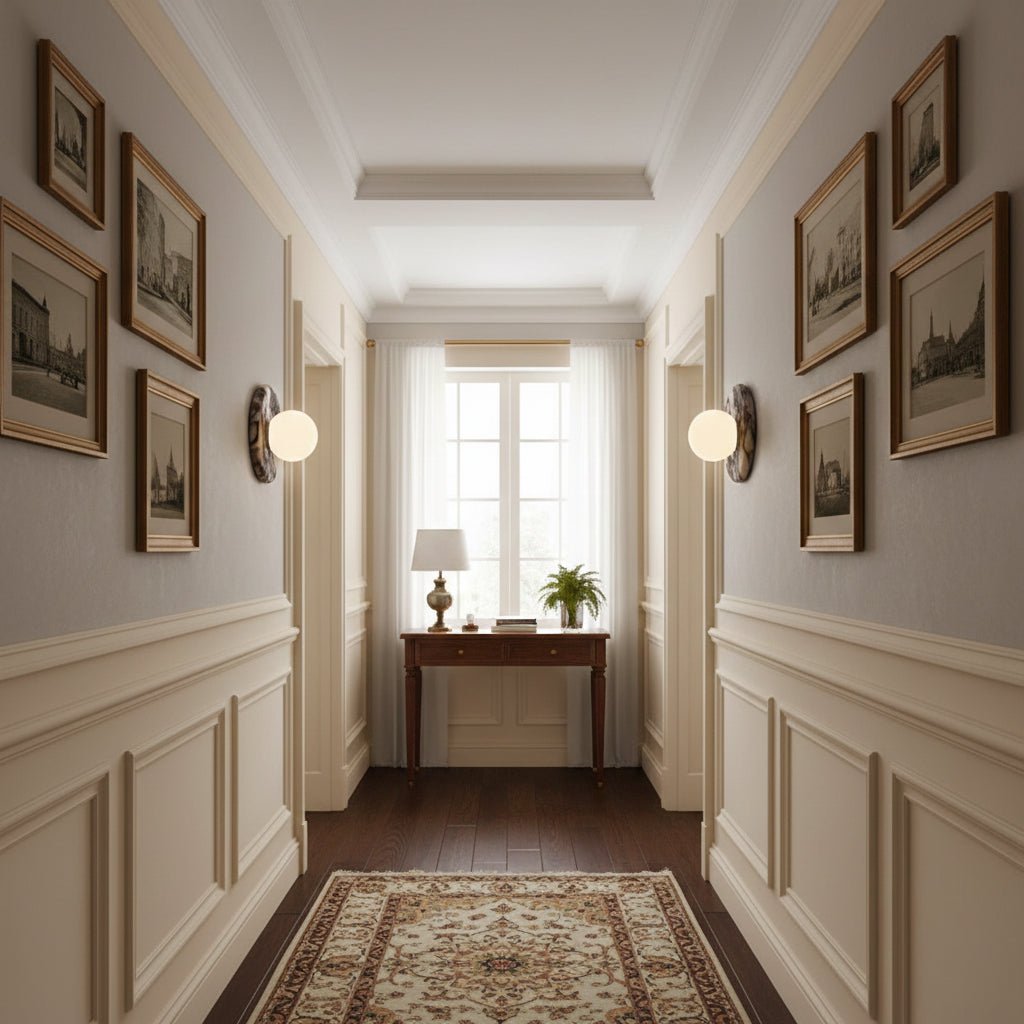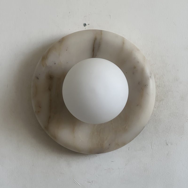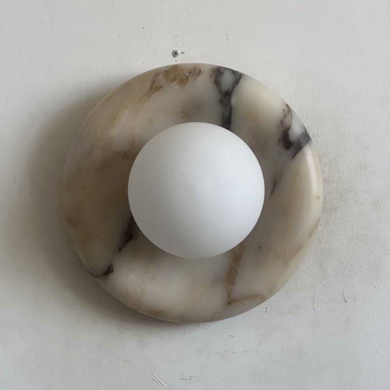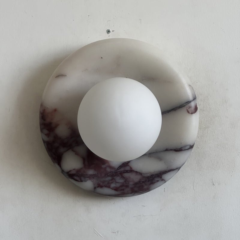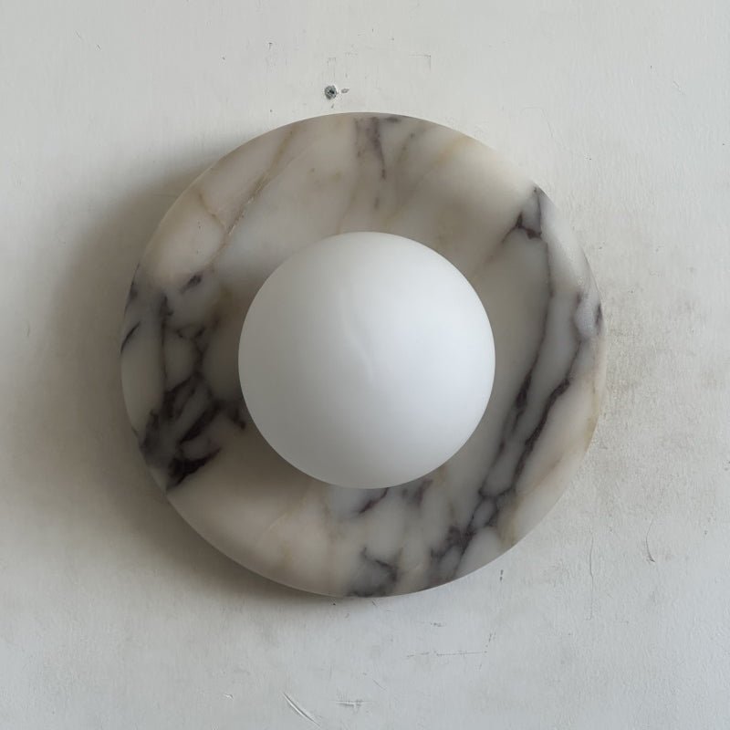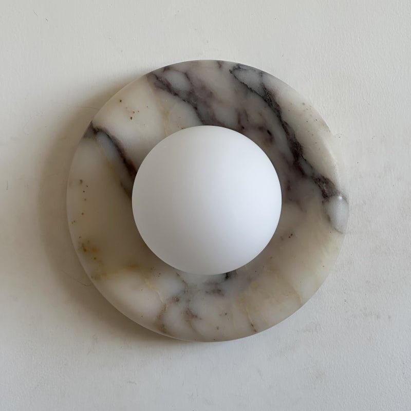 The Wall Lamp masterfully merges contemporary style with classic elegance. Featuring a perfectly round form and a central glass globe set against a curved marble backplate, it adds a sophisticated touch to any space. Ideal for enhancing the ambiance in hallways, living rooms, or bedrooms, this wall light illuminates with a soft, layered glow.