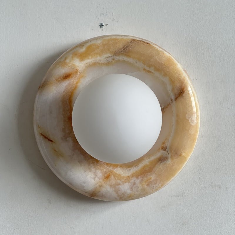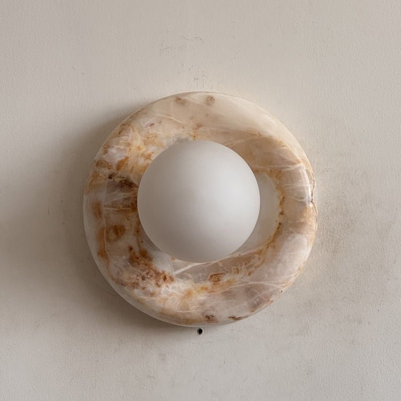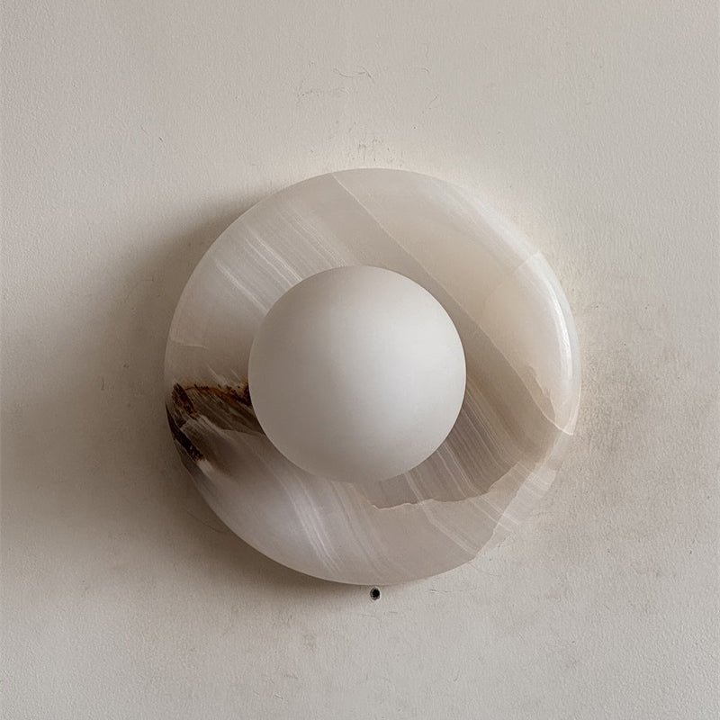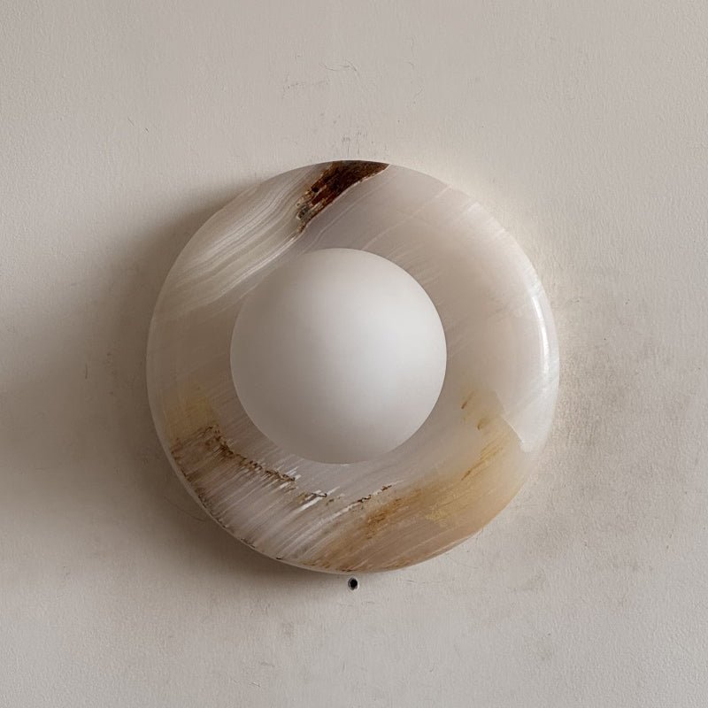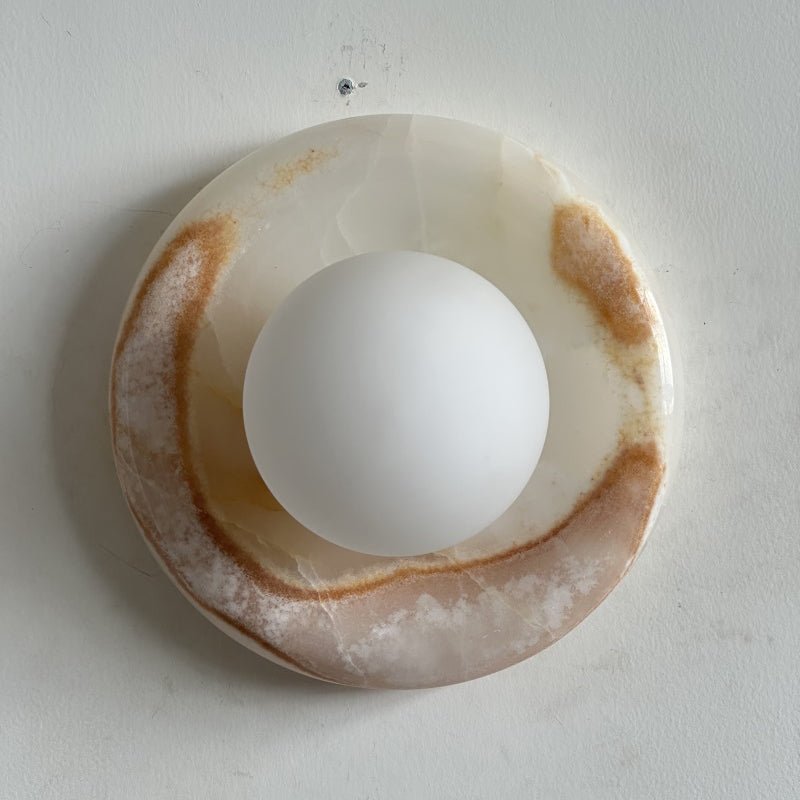 This wall sconce is made from natural stone, and each piece is one-of-a-kind in color and veining.