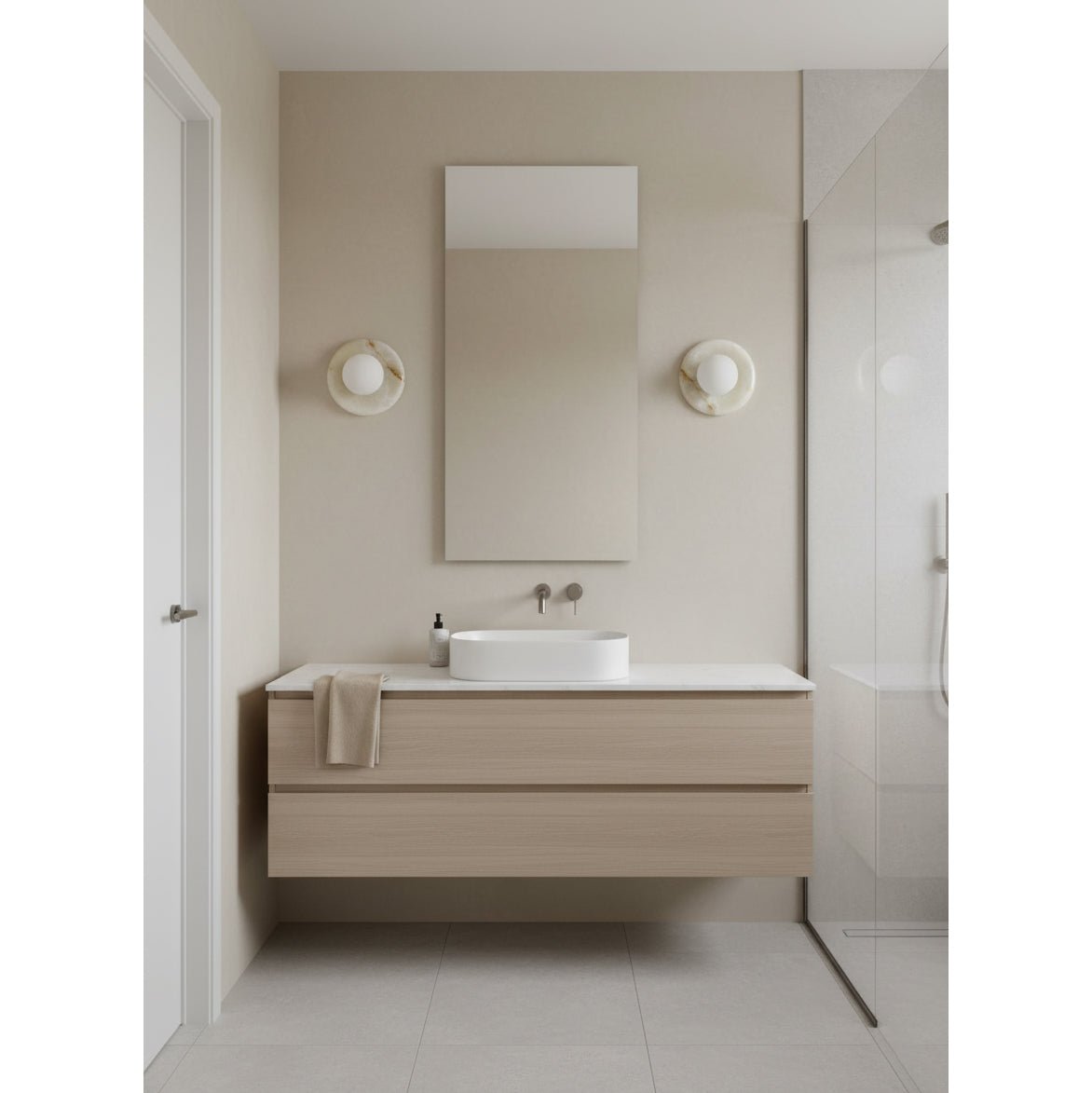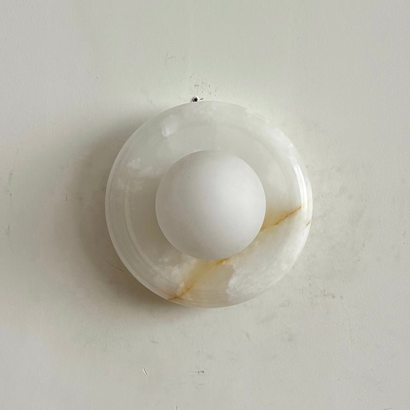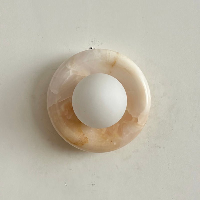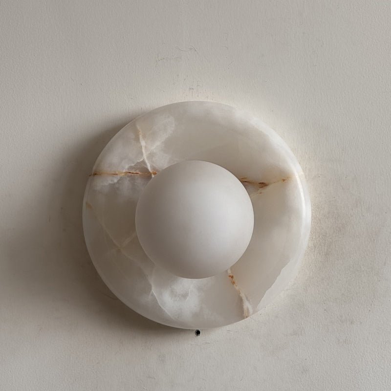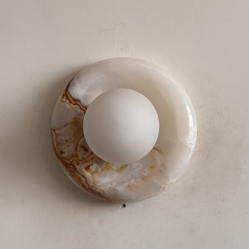 This wall sconce is made from natural stone, and each piece is one-of-a-kind in color and veining.