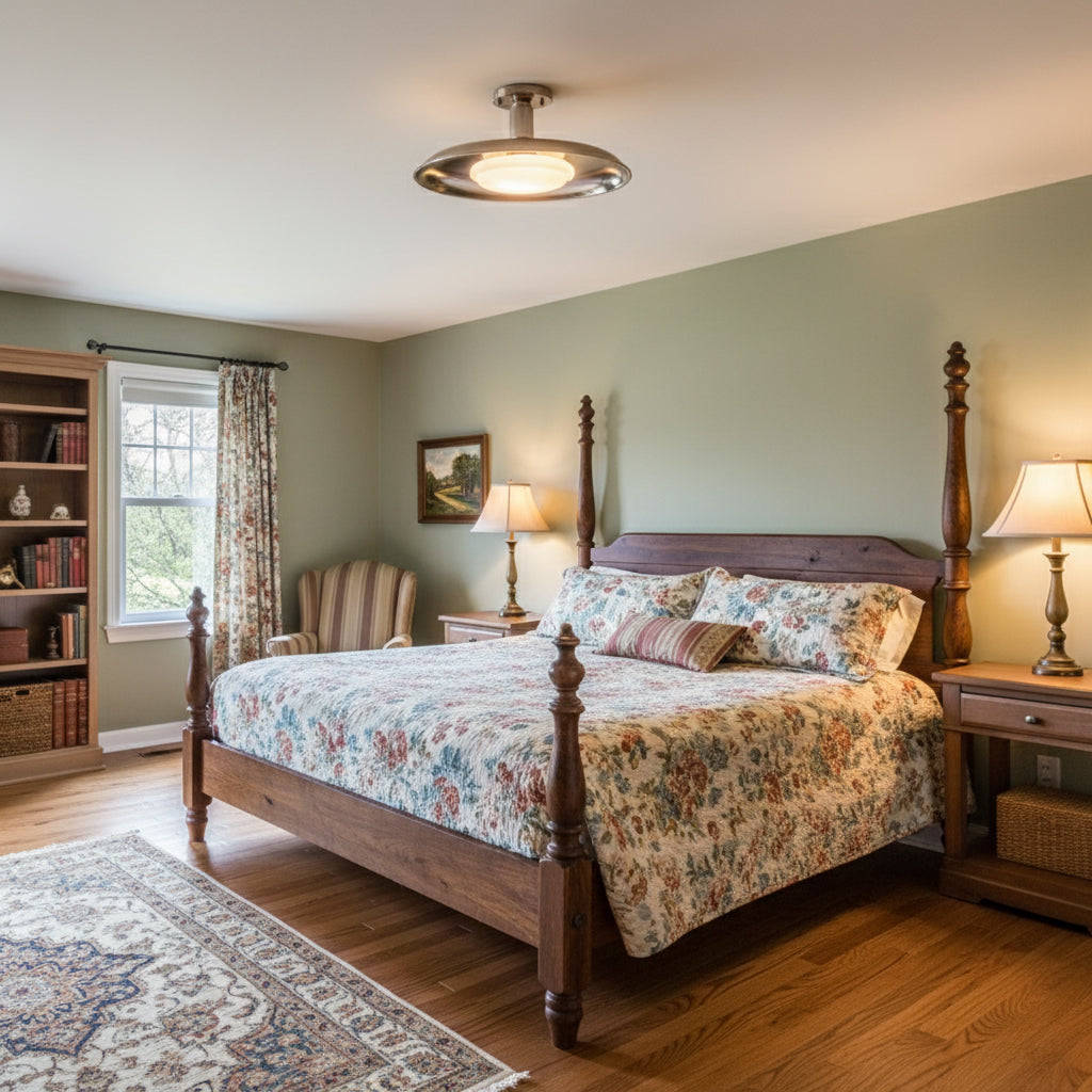 The metal canopy features a subtle, naturally textured finish—a result of the lamp’s intentional design process. These delicate variations in tone and pattern are part of the fixture’s unique character, giving each piece a one-of-a-kind look.