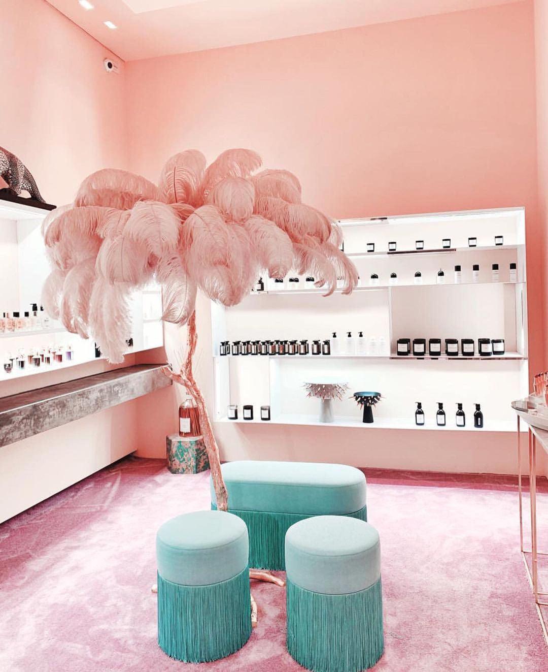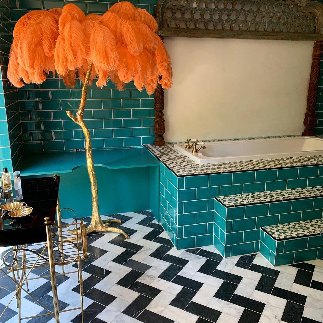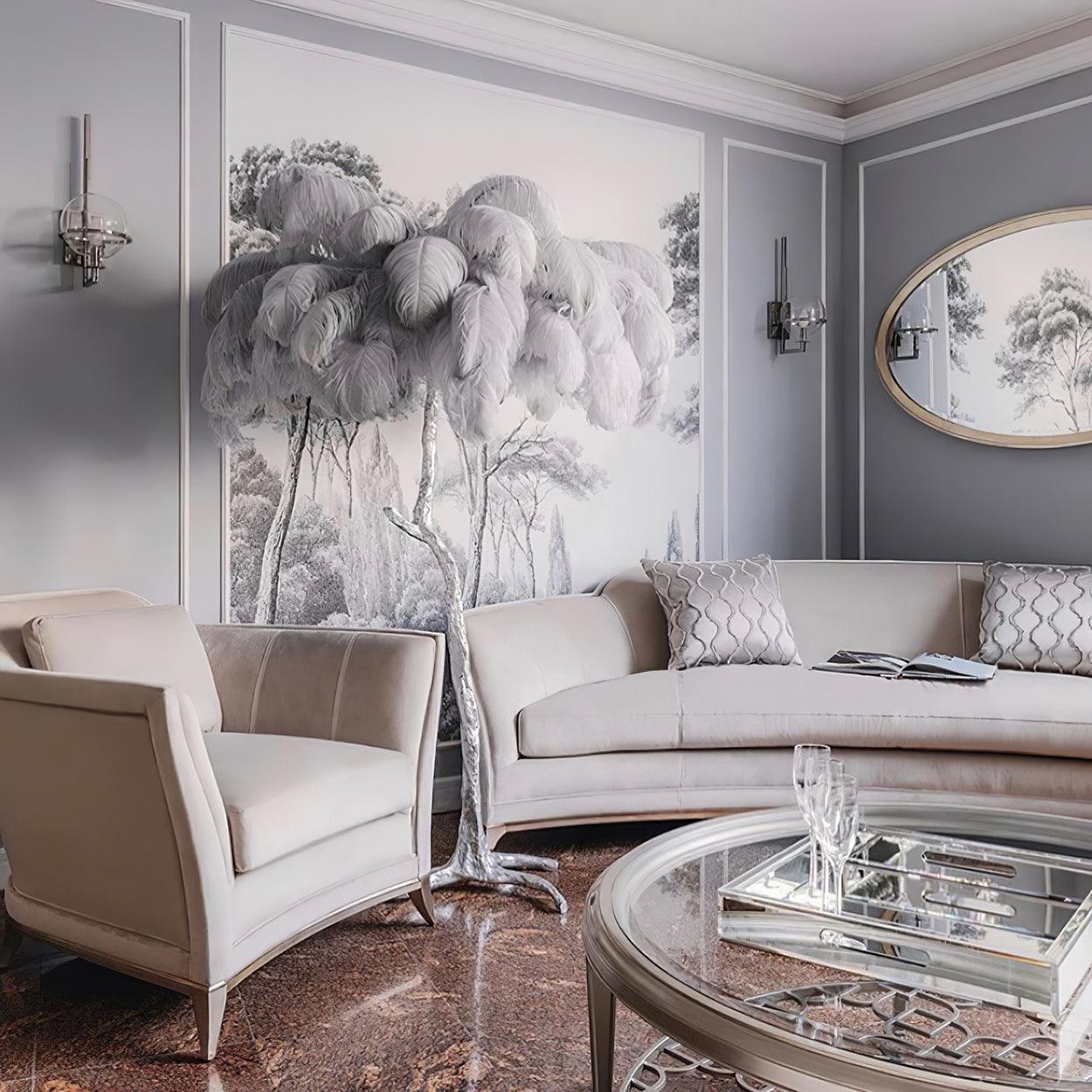 The Ostrich Feather Floor Lamp is a palm-tree-inspired lighting fixture featuring natural ostrich feather foliage and a brass metal base. This standing lamp is designed for indoor interior settings, providing ambient lighting through its layered plume structure.