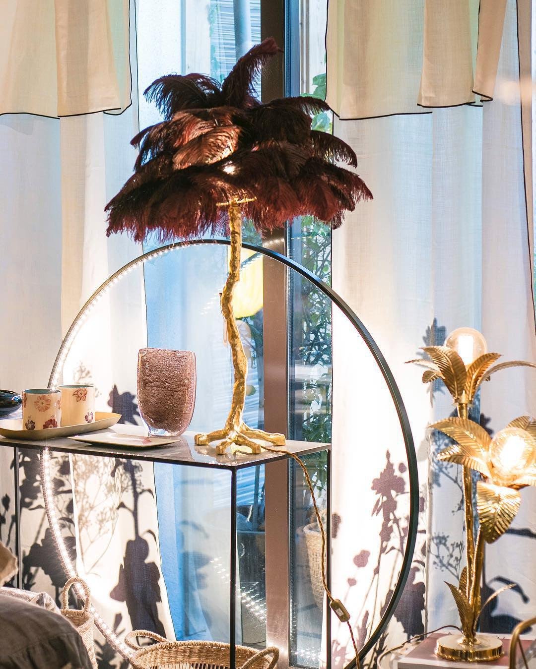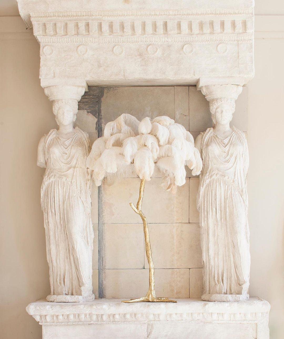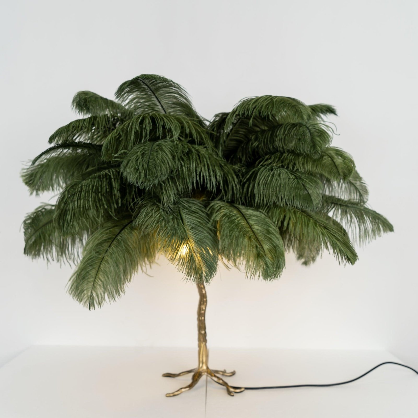 The Ostrich Feather Table Lamp is a sophisticated lighting fixture that combines natural textures with a refined metal structure. Featuring a plume of hand-dyed ostrich feathers, this lamp is designed to resemble a stylized palm tree, offering a soft and diffused glow that enhances interior spaces. The fixture is supported by a solid brass base, ensuring stability and a polished finish.