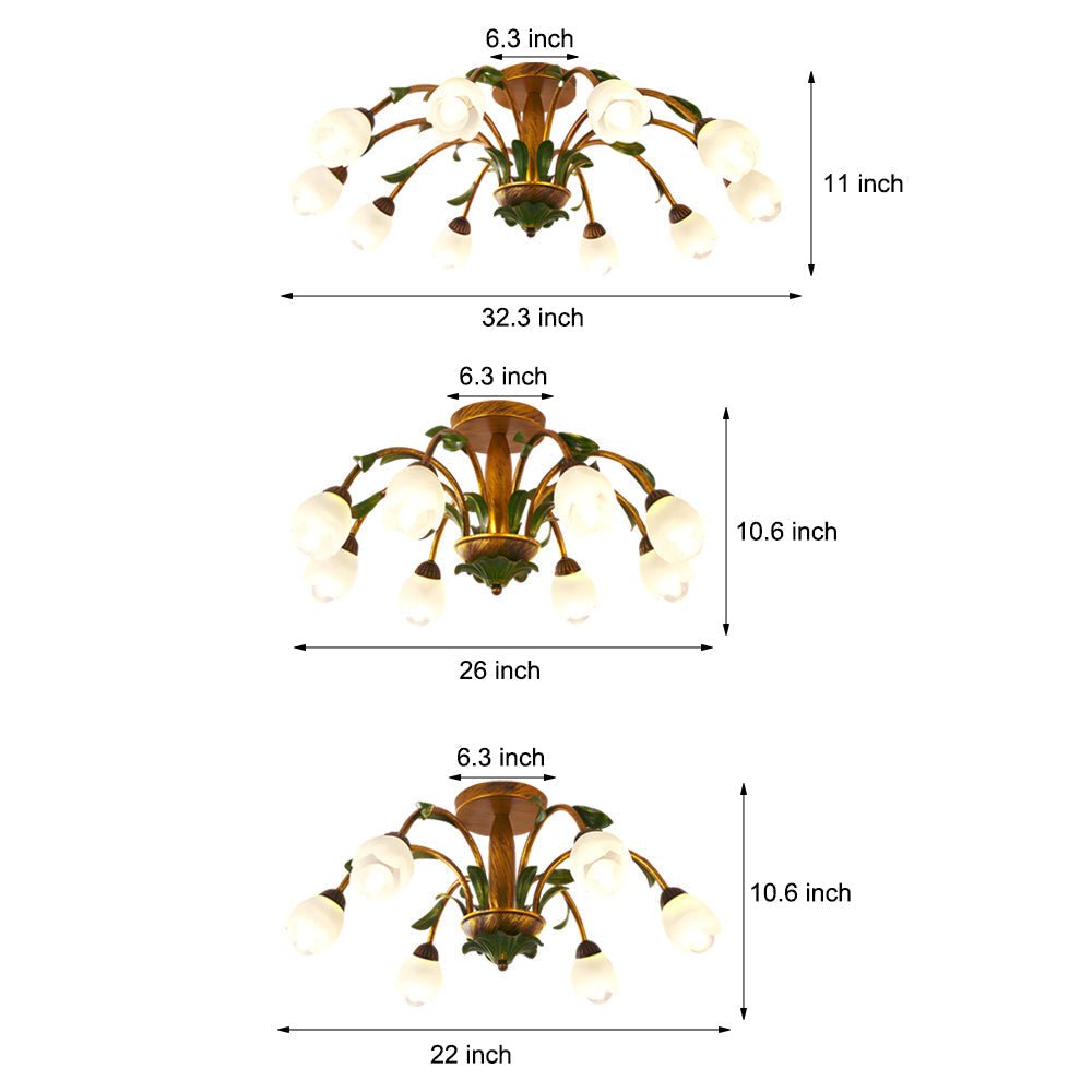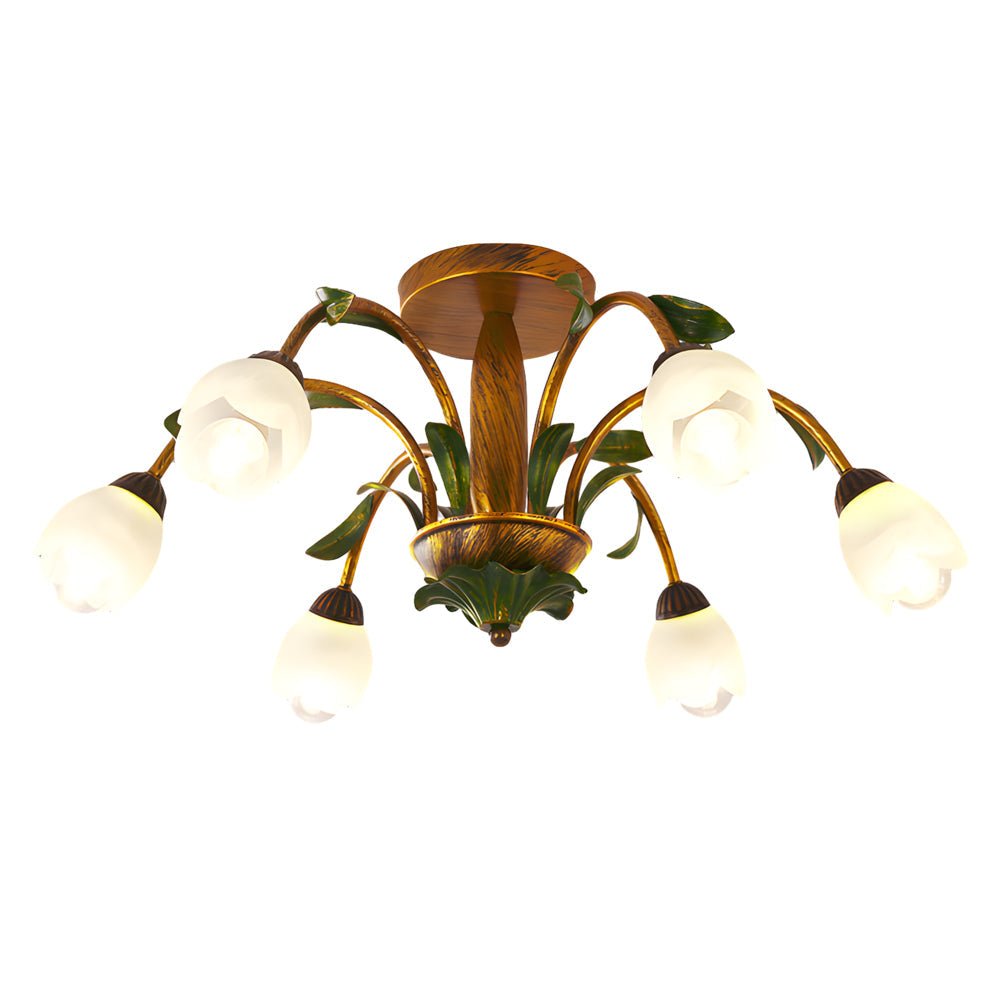 This ceiling light features a delicate floral design, adding an elegant touch to various interior spaces. It incorporates an antique iron lamp body and a glass lampshade, contributing to a classic retro style. This design is suitable for American, pastoral, country, and French-style homes.