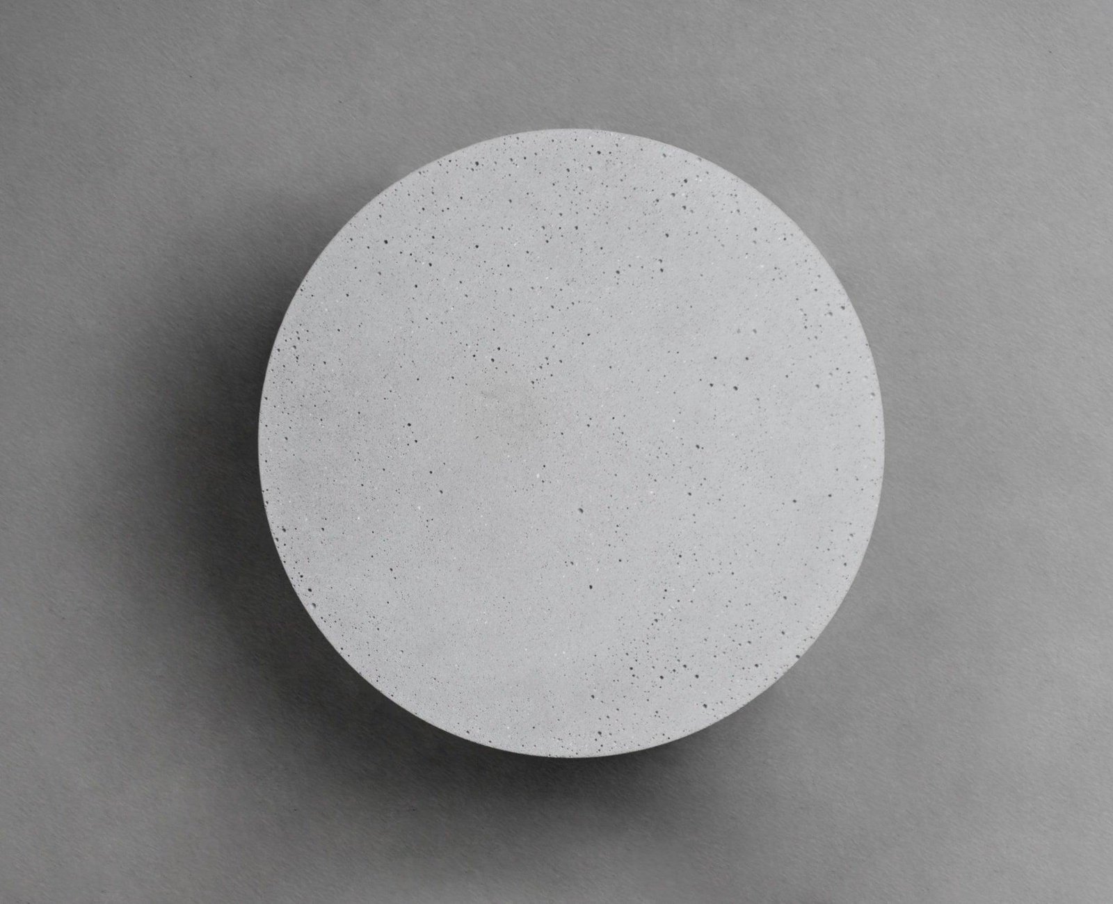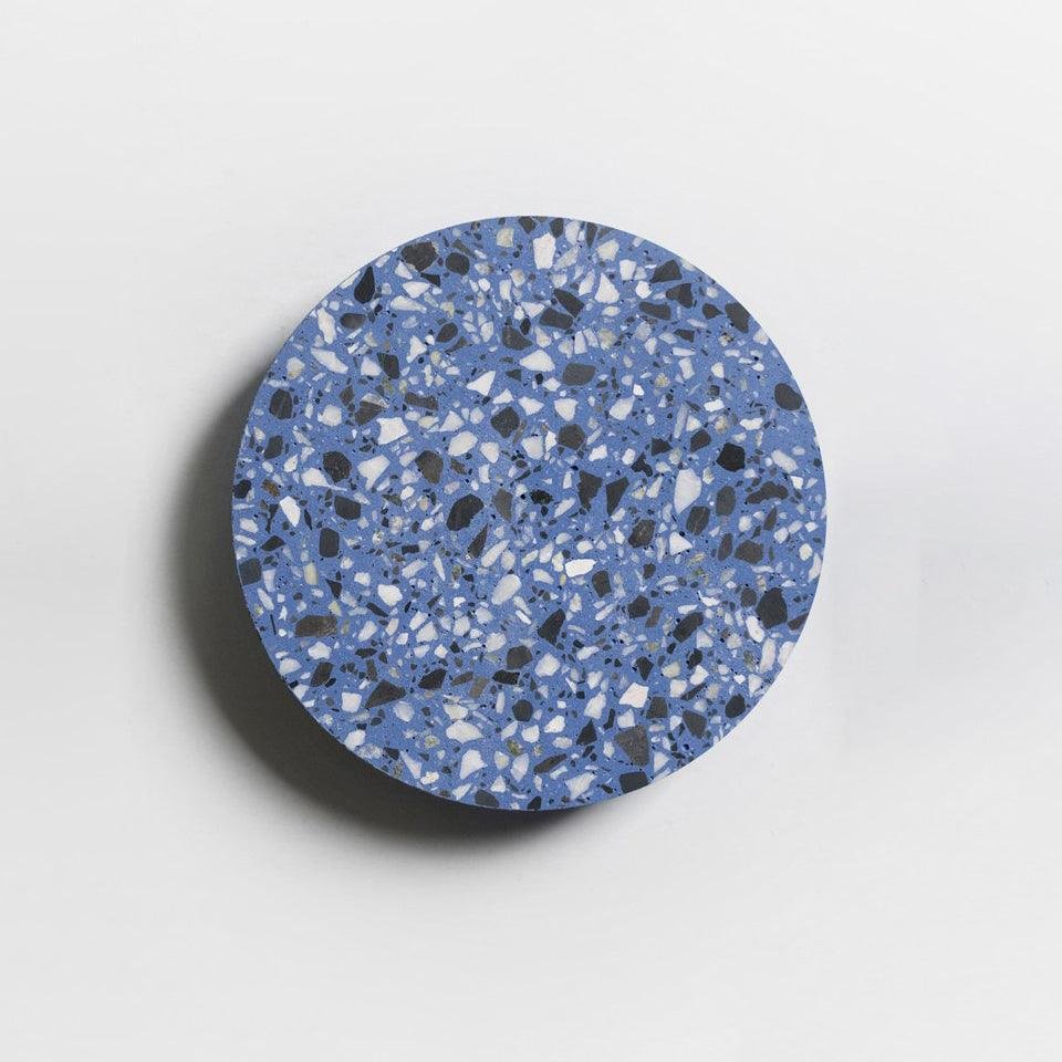 The PIN wall lamp features a distinctive design crafted from terrazzo and aluminum. It is available in various finishes: Cement Grey, Black Terrazzo, White Terrazzo, Red Terrazzo, and Blue Terrazzo. Please note that the Cement Grey finish is made of concrete.