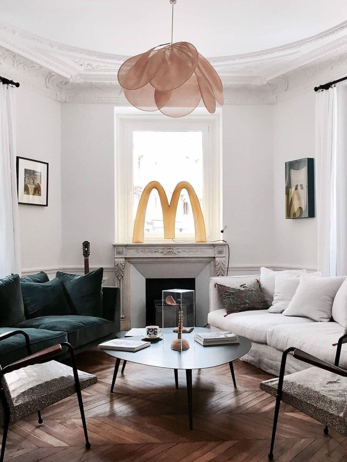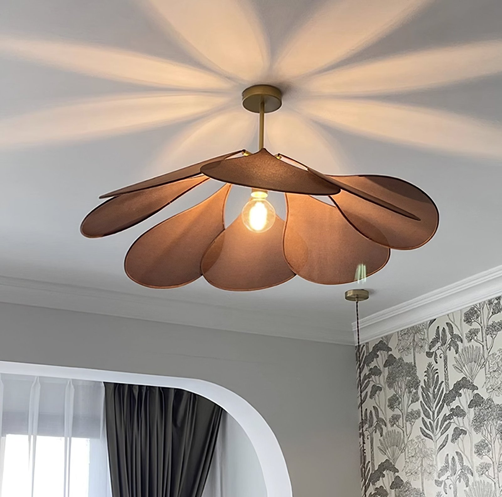 The MINIHOUZZ pendant light features an unexpected combination of metal and fabric, presented in a floral and airy suspension design. With the sleekness of a teardrop-shaped petal, this fixture offers an homage to classic louvered ceiling fans. This pendant subtly diffuses light, creating a soft clarity in the room and delicate shadows on the ceiling.