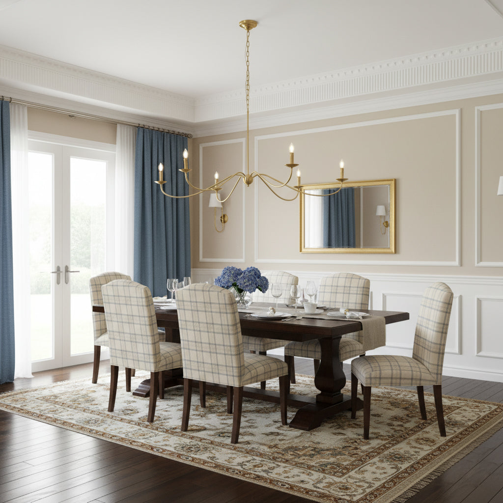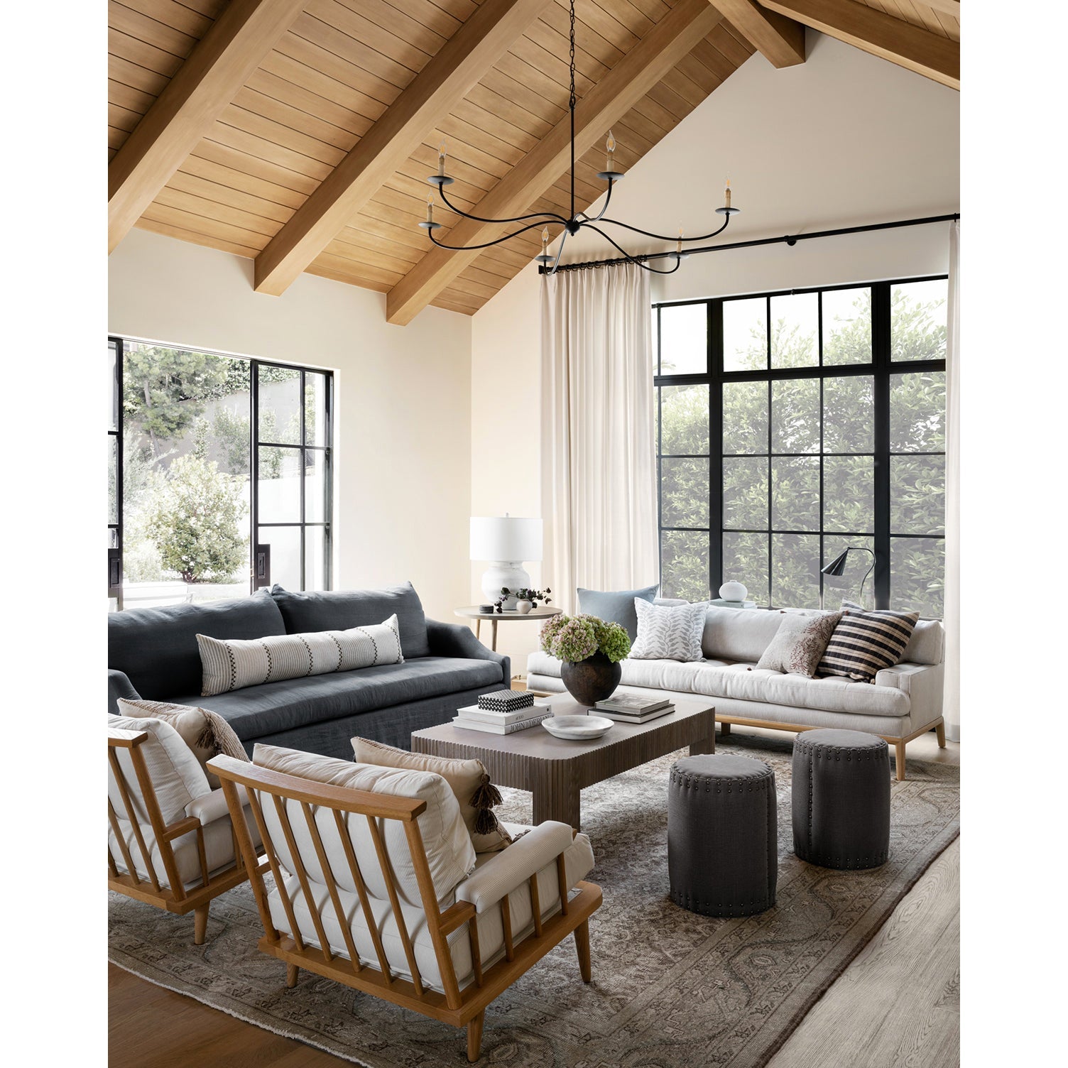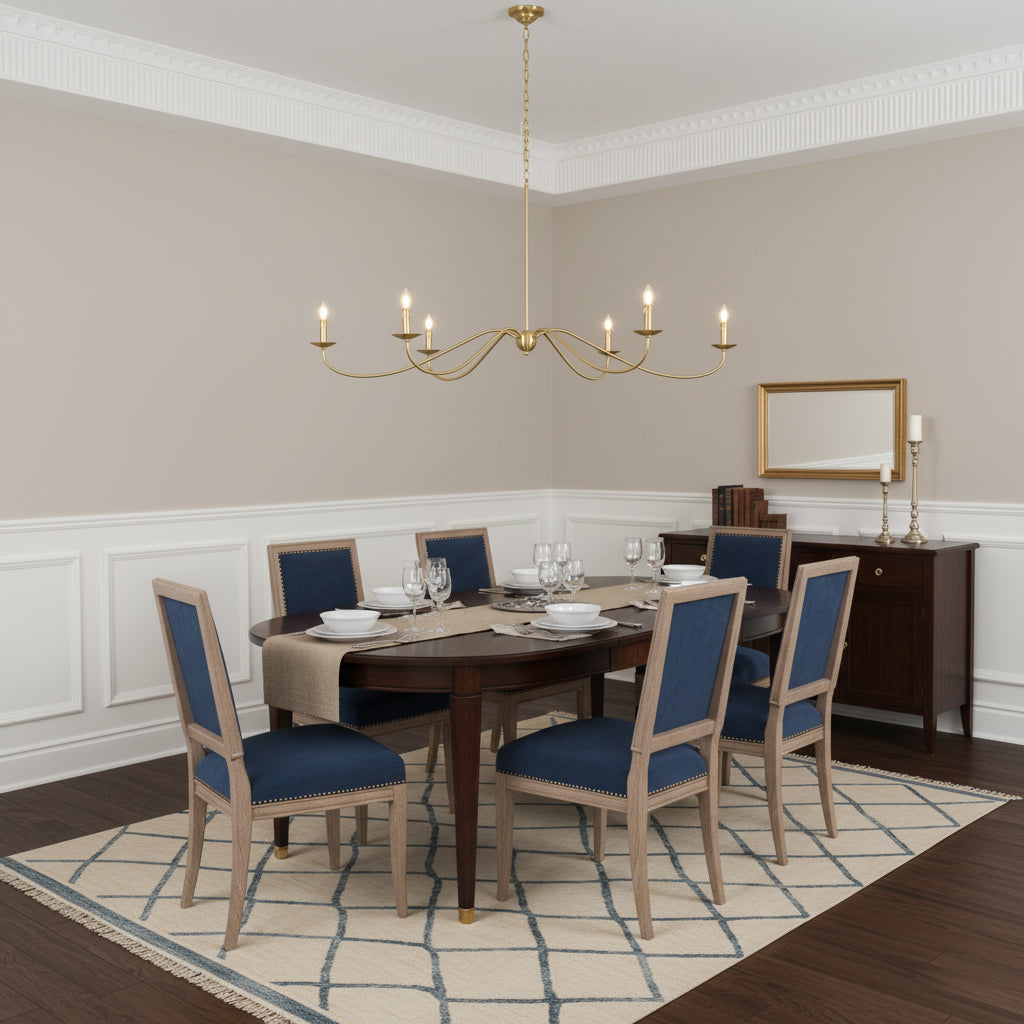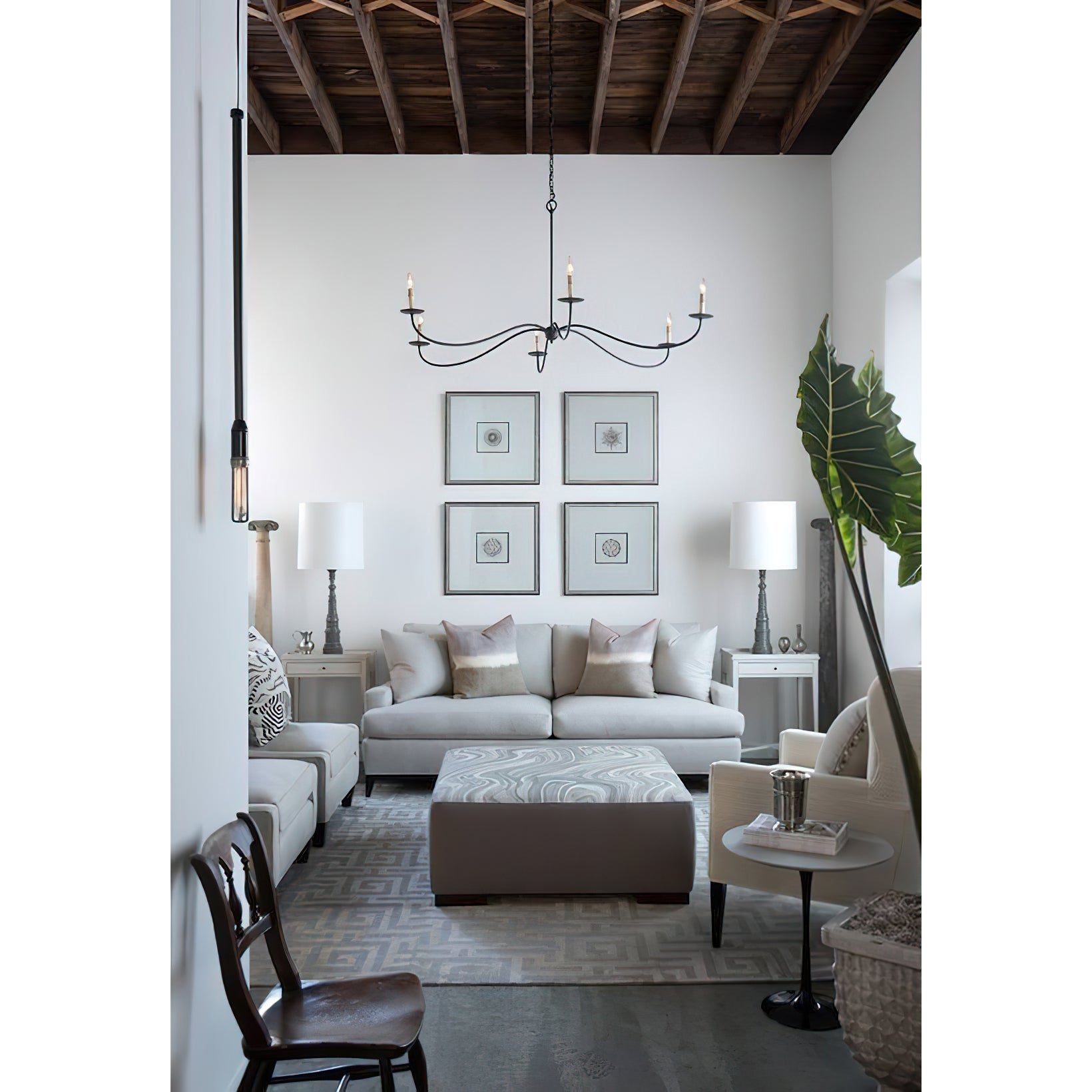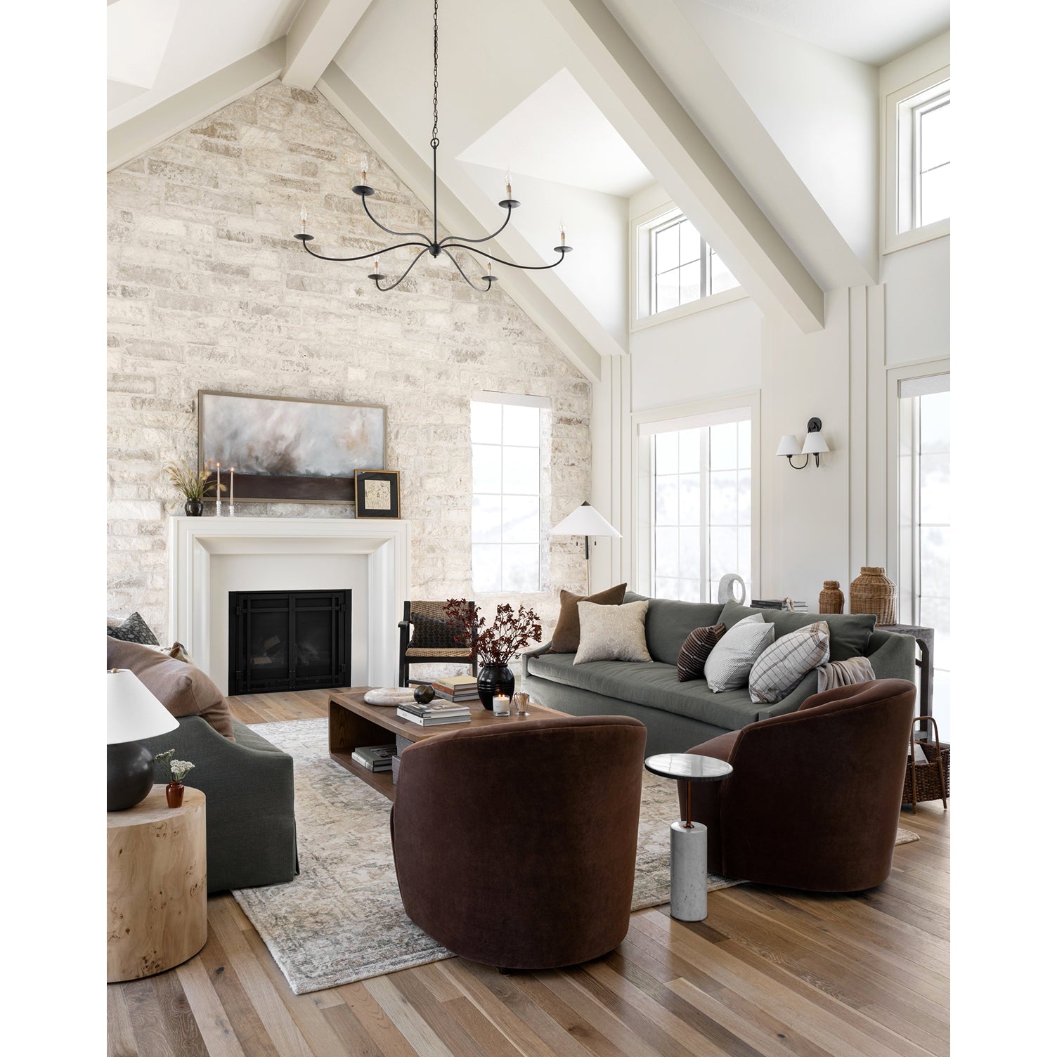 This monumental chandelier extends to an impressive 63 inches in diameter. Its shape and finish are nods to a bygone era, while its slender, gracefully arcing lines create a modern profile.
