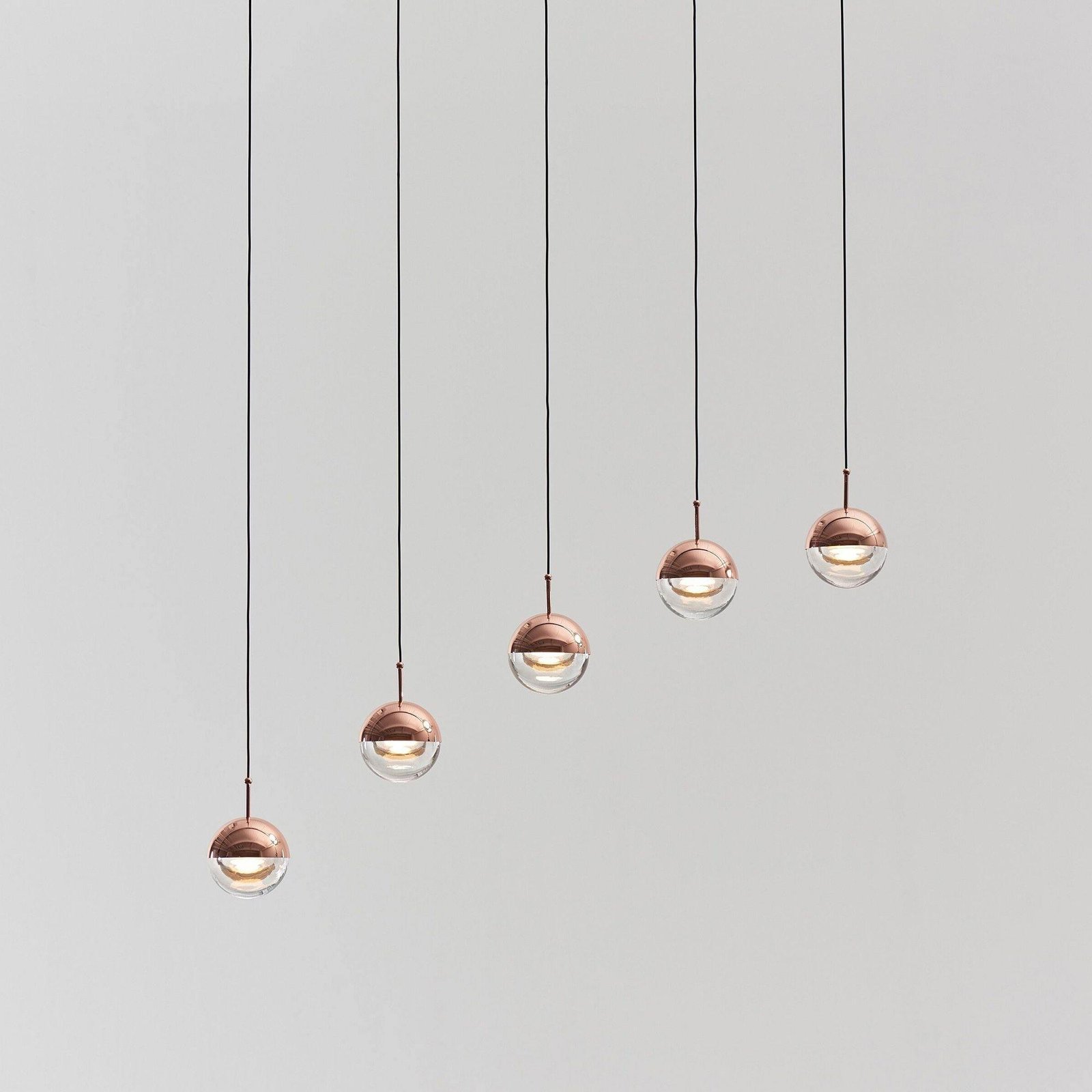 Ideal for living rooms or bedrooms, this pendant light can illuminate areas such as a bookcase or a display of objects. It is available with a shiny copper finish, clear glass, and includes an LED lamp.