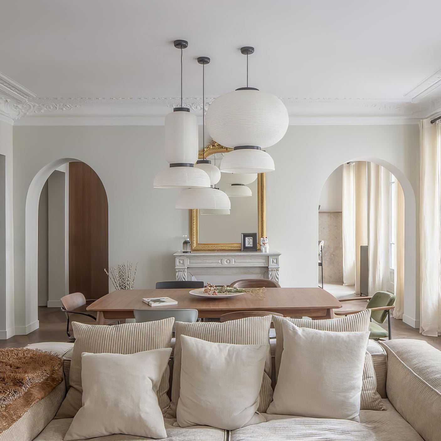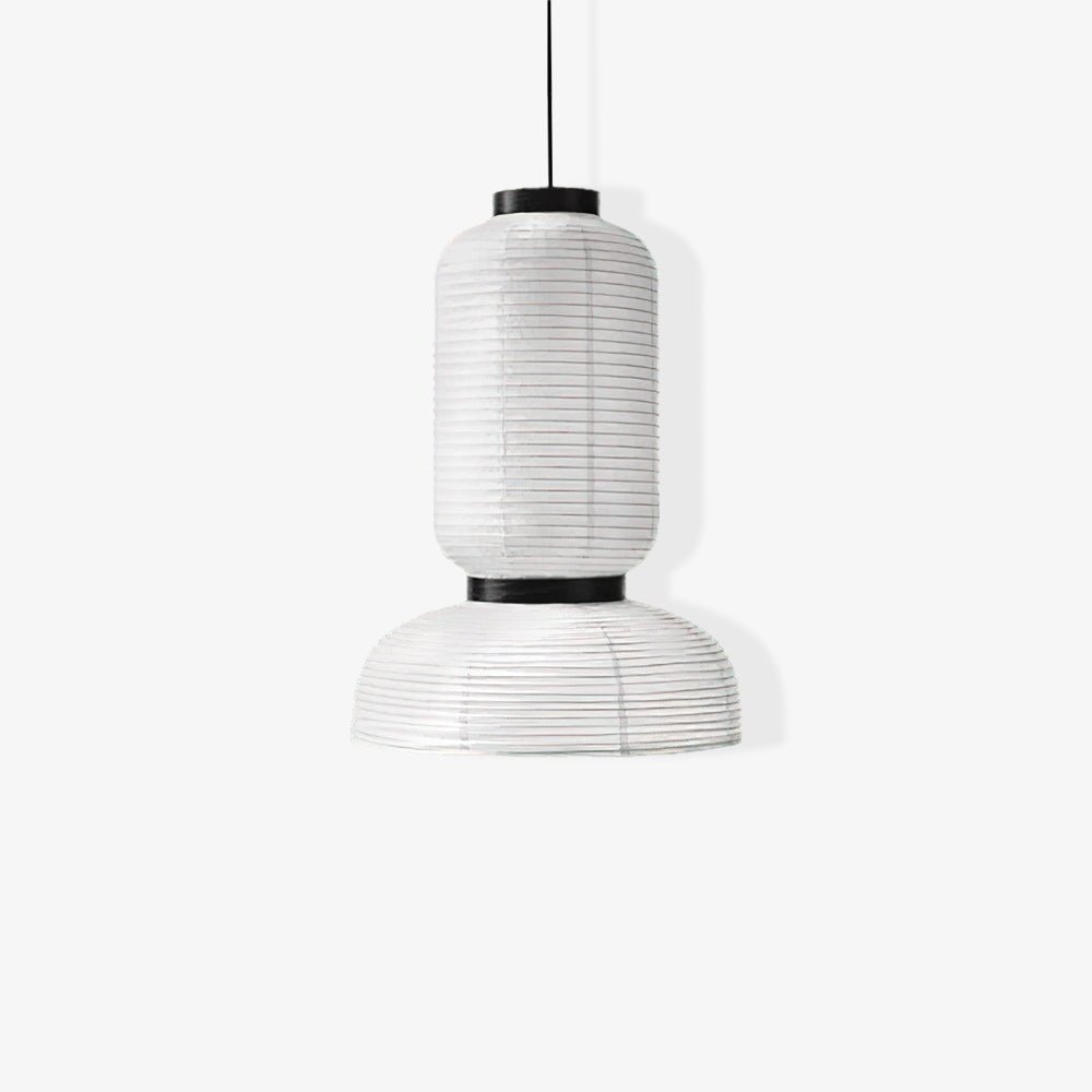 The Paper Lantern Pendant Light is a contemporary interpretation of traditional lantern designs, focusing on the interplay between material texture and light diffusion. This fixture features a handmade shade crafted from ivory white rice paper, which provides a soft, ambient glow suitable for various interior settings. The design is punctuated by black stained oak rings that offer structural definition and visual contrast. An open-bottom construction ensures focused illumination while maintaining the lightweight aesthetic of the fixture.