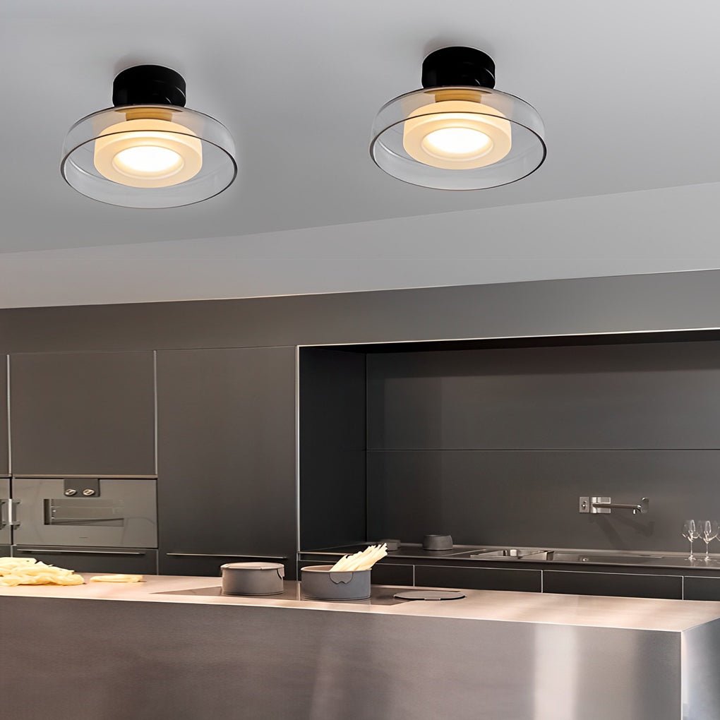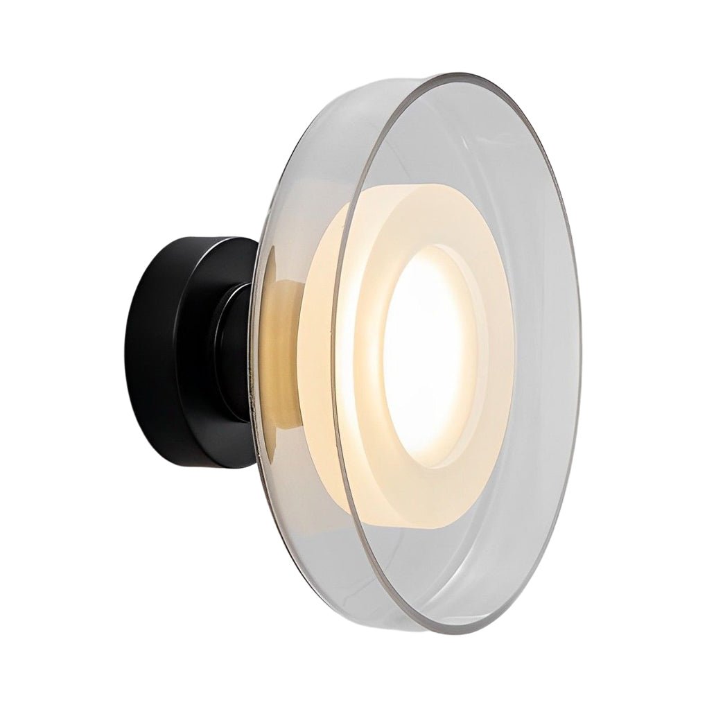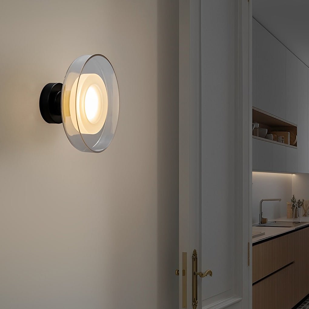 - This post-modern round glass wall lamp features a design crafted from quality hardware and glass materials. It is available with either a smoke gray or a clear glass shade, providing options to complement various interior styles and enhance the aesthetic of any space.