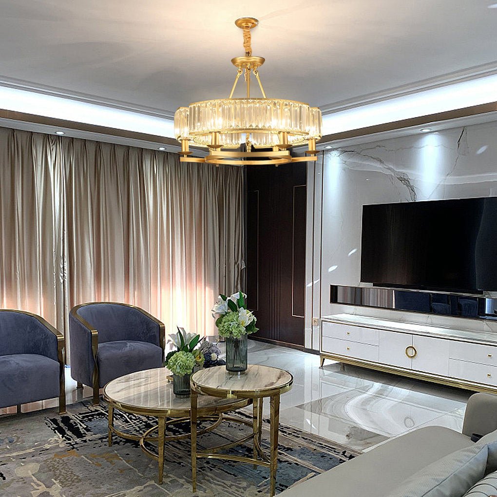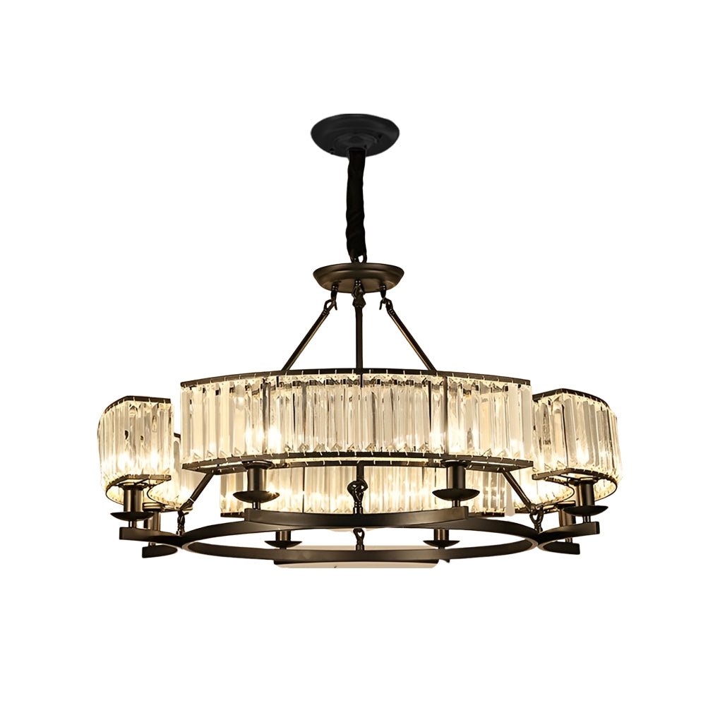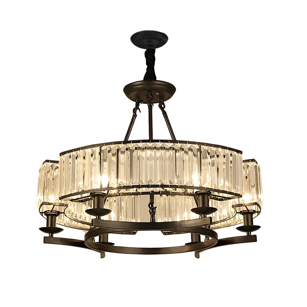 - This rustic crystal chandelier features metal and crystal lampshade components, creating a retro and elegant atmosphere.