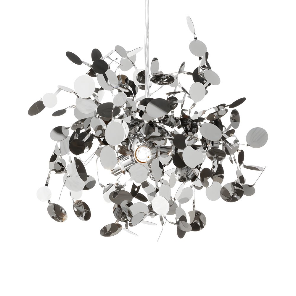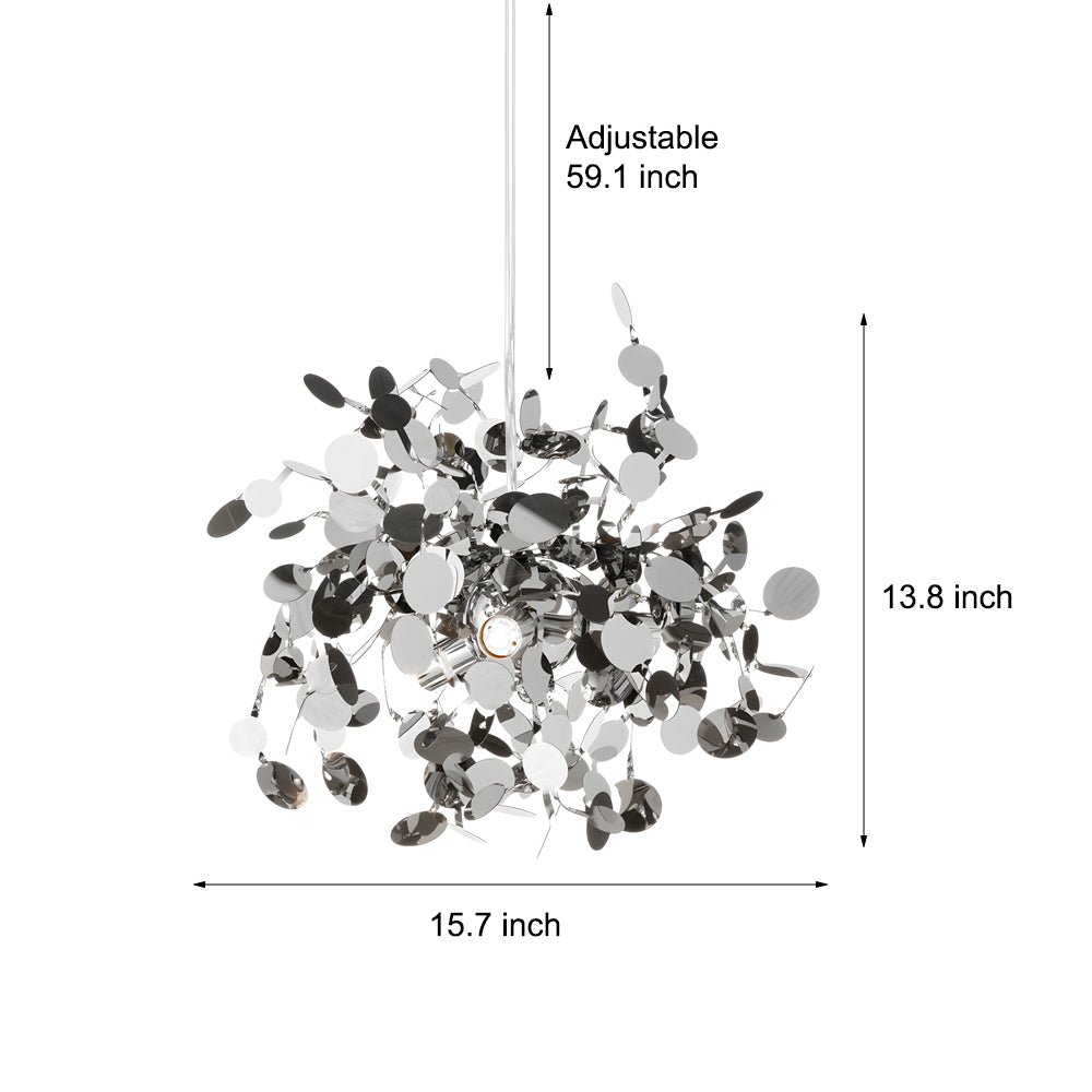 This chandelier features stainless steel material, meticulously crafted through electroplating and other precise processes. Its design evokes the intricate form of a metal firework or dandelion, offering a distinctive texture and shape.