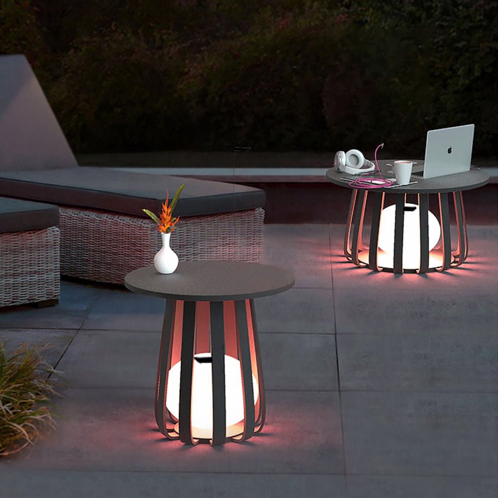 This outdoor solar light design integrates a lighting fixture with a small coffee table. It provides illumination while also offering a surface to place items such as vases, cups, books, or other small objects.