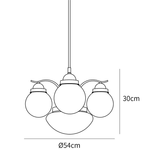 The Ryttenberg Chandelier features a retro-chic aesthetic with classic globe-shaped white glass elements. Its Copper plated or Chrome finish enhances the richness of the lamp body. This fixture is offered with a variety of glass cover finishes to complement diverse interior styles.