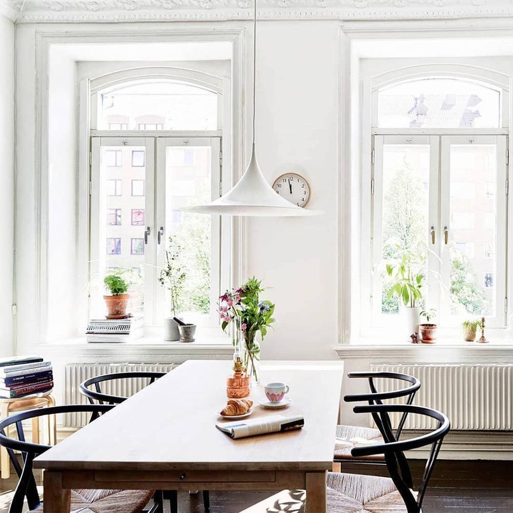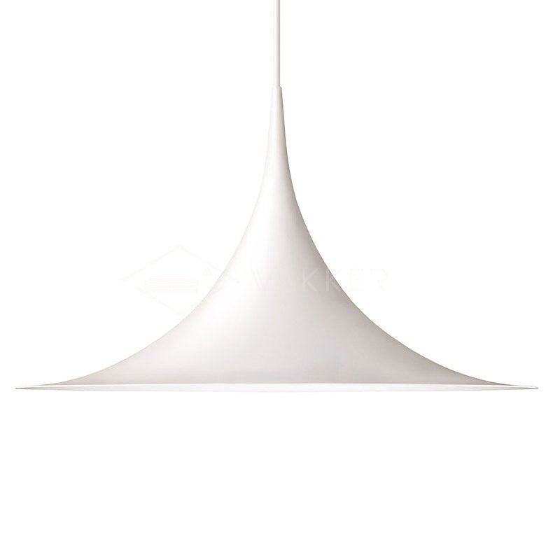 The MINIHOUZZ Semi Pendant Lamp features a distinctive design, formed by two quarter-circles joined back-to-back. Its unique arch-shaped, enameled metal shade offers a light and timeless aesthetic. The lamp’s lacquered, spun aluminum shade creates a diffused, cone-shaped light, making it ideal for illuminating a dining table or kitchen work surface.