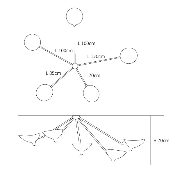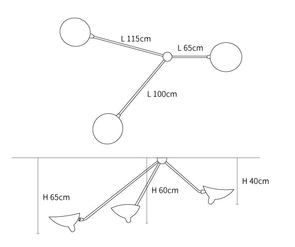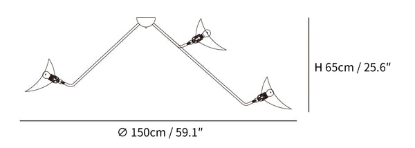 The Three Arm Ceiling Lamp is a suspended lighting fixture characterized by a dynamic and sculptural aesthetic. This lighting solution features specialized hardware including a washer and six-sided screw assembly, combined with uniquely formed reflectors and the refined lines of steel tubes. The design provides a functional and architectural element to interior spaces.