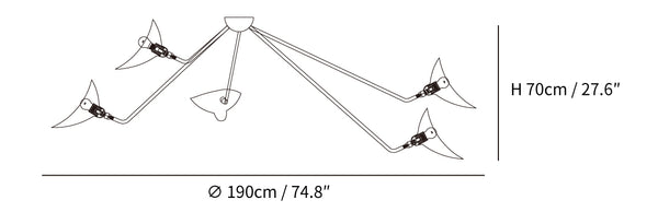 The Three Arm Ceiling Lamp is a suspended lighting fixture characterized by a dynamic and sculptural aesthetic. This lighting solution features specialized hardware including a washer and six-sided screw assembly, combined with uniquely formed reflectors and the refined lines of steel tubes. The design provides a functional and architectural element to interior spaces.