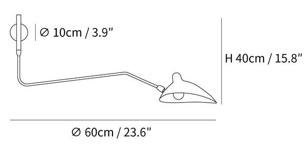 The articulating arm allows for directional light projection across a space. The shade features independent rotation, providing adjustable illumination to suit specific needs.