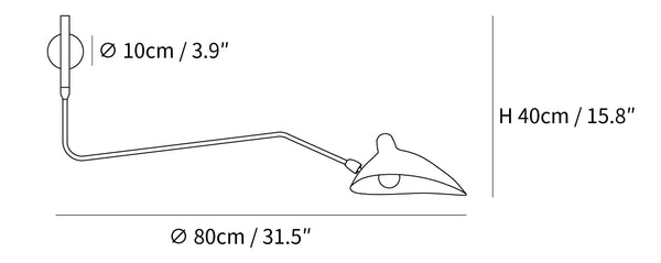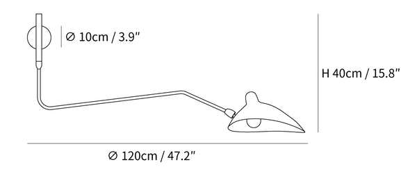 This wall sconce features insect-like designs, characteristic of modern lighting from the 1950s. The design emphasizes delicate lines and a refined visual aesthetic. The One-Arm wall sconce is designed for versatility in various indoor settings.