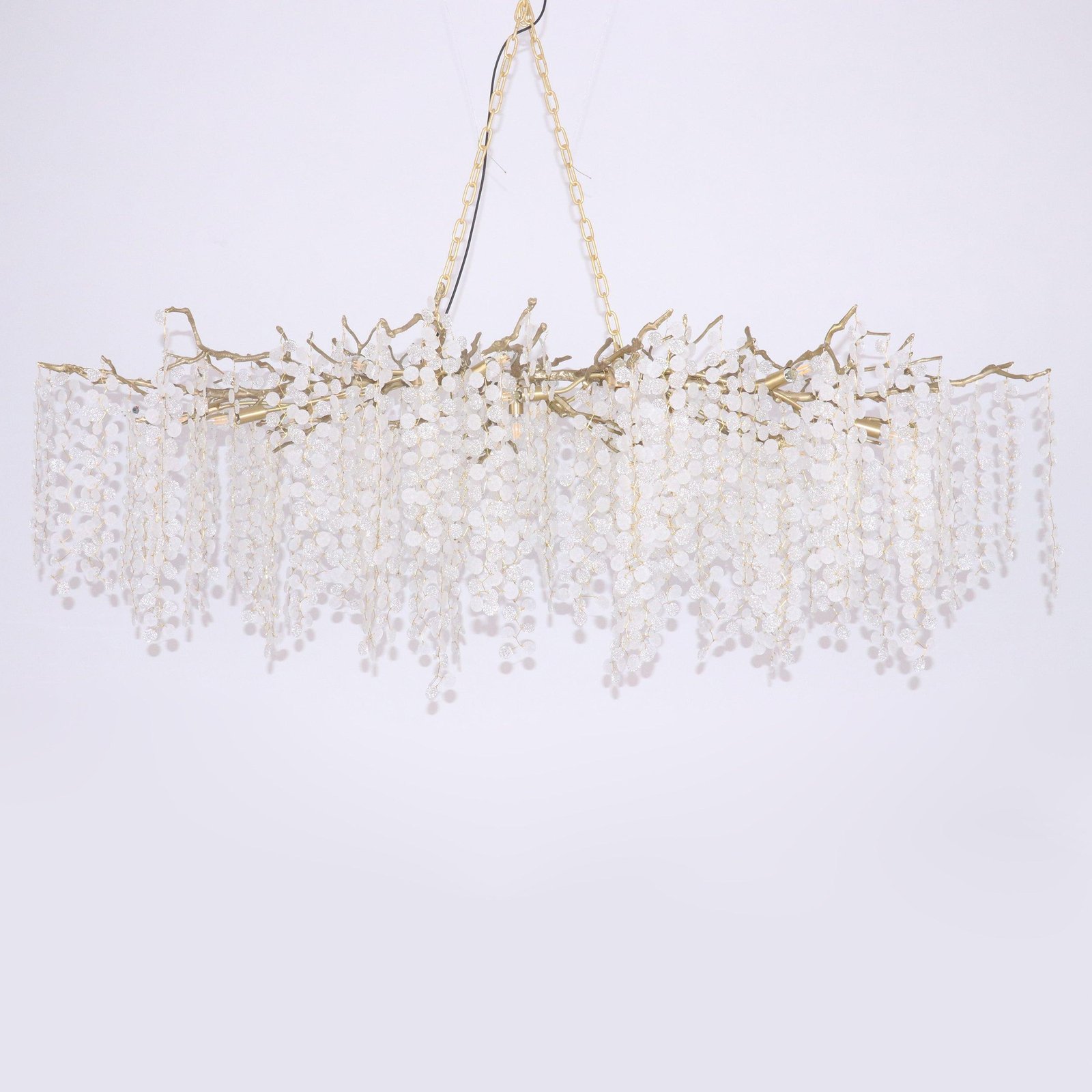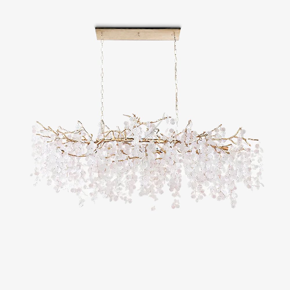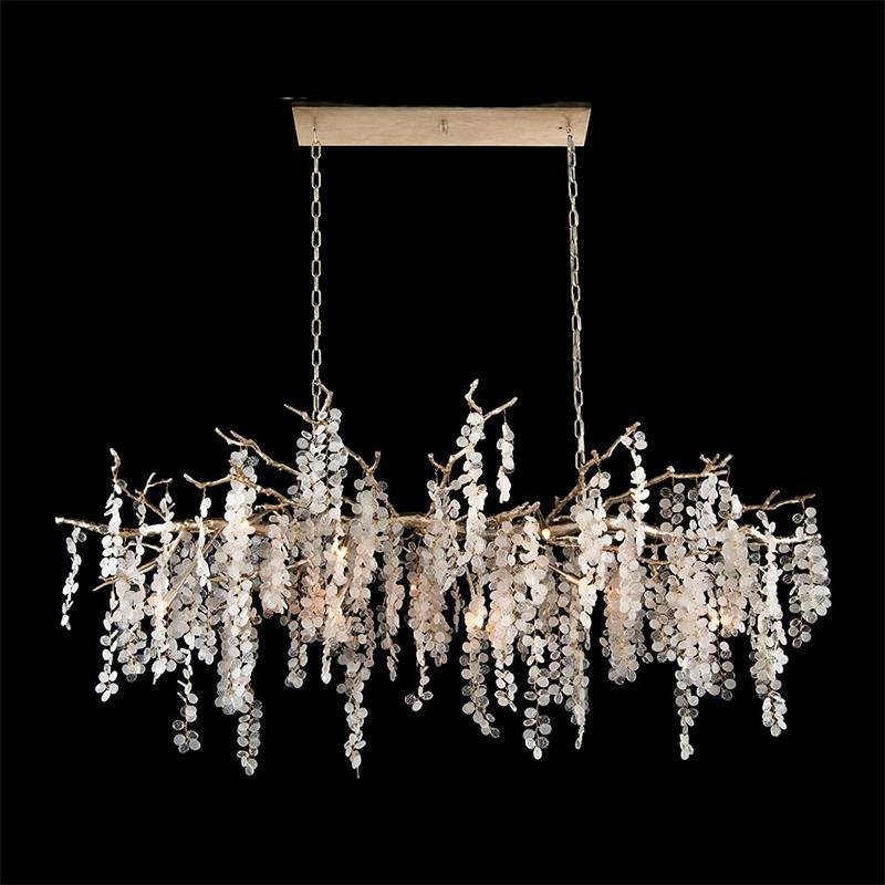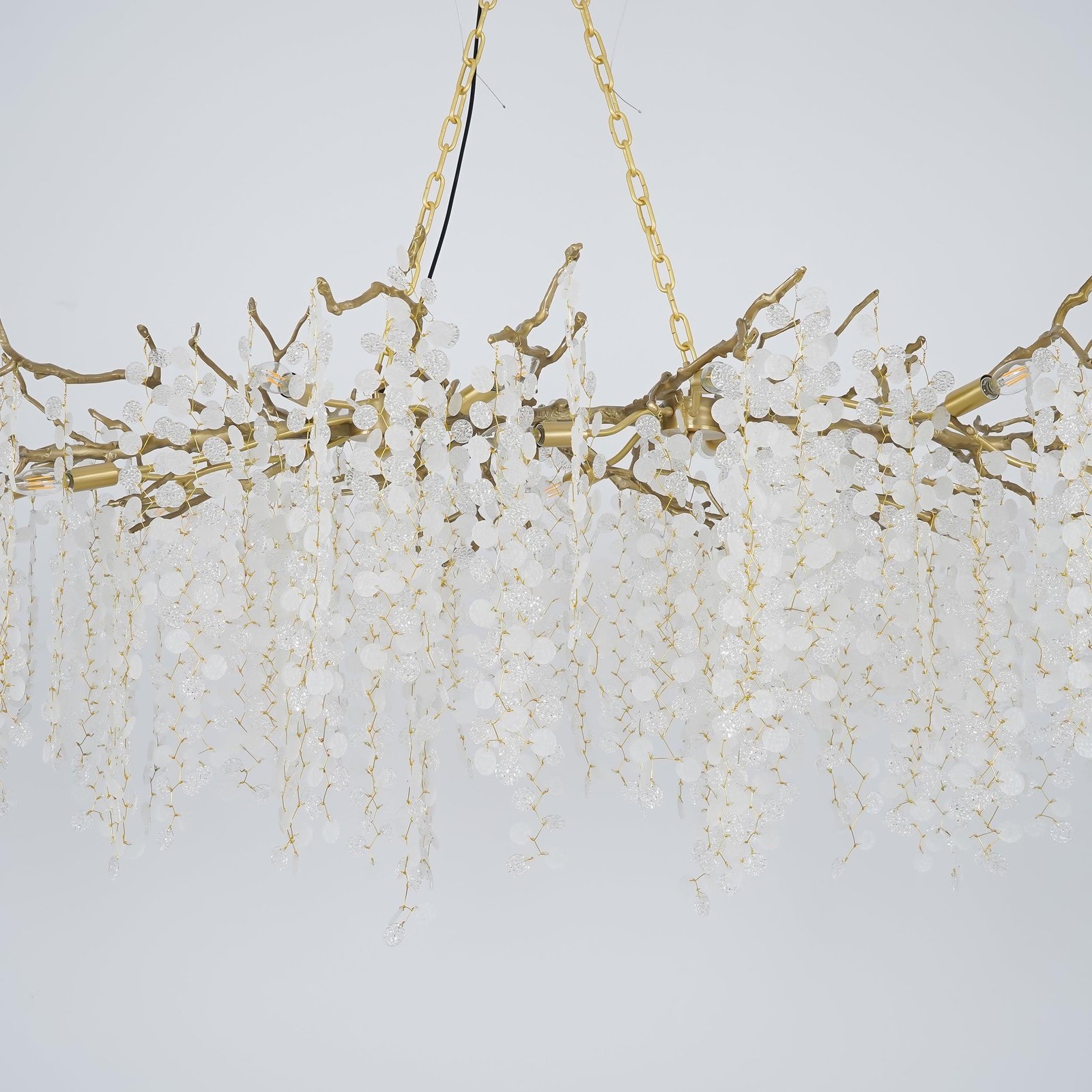 Like dewdrops under a forest canopy, the Shiro Noda Chandelier collection displays glistening glass coins that cascade from organic leaves and branches. A modern nod to nature, this collection is a natural in contemporary settings. This chandelier is large enough to hang in a great room, foyer, or dining and living rooms with high ceilings.