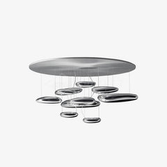 This ceiling luminaire, a further development within the Hydro series, features a design where a series of pebble-like units form a bright, reflective surface. Light reflects off these biomorphic forms. This in-ceiling fixture is designed for indirect halogen lighting. The Skydro units are constructed from molded thermoplastic with a polished chrome finish.