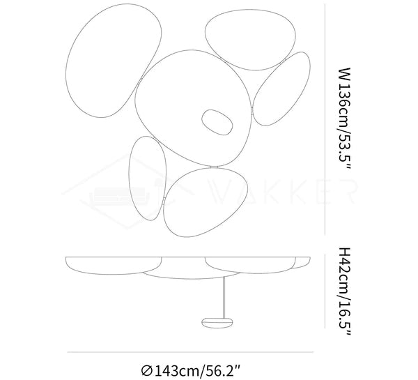 The fixture is available in two configurations: Electrified, where indirect light is emitted from die-cast polished aluminum pebbles integrated into the luminaire. The Non-electrified version is designed for accent light provided by a separate, external light source. Individual modules can be grouped to create various ceiling arrangements. An assembly kit (template) is required for joining multiple units, with one kit sufficient regardless of the number of units linked. A kit is not needed for a single unit installation.