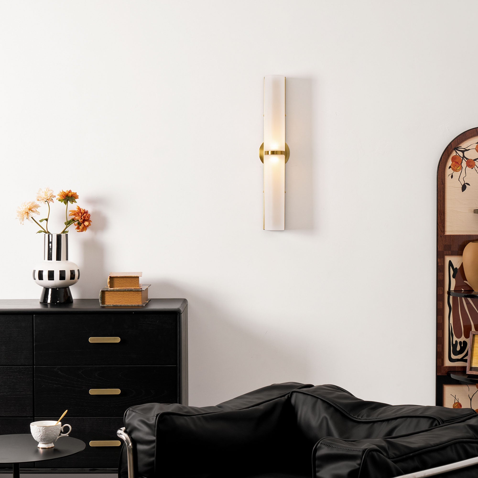 Inspired by sophisticated modern aesthetics, this wall lamp reinterprets mid-century modernism in architectural form and refined simplicity. The design evokes effortless glamour through its arresting restraint. Its light source is housed within an elongated arch of mouth-blown glass and framed in hand-finished metalwork by local artisans.