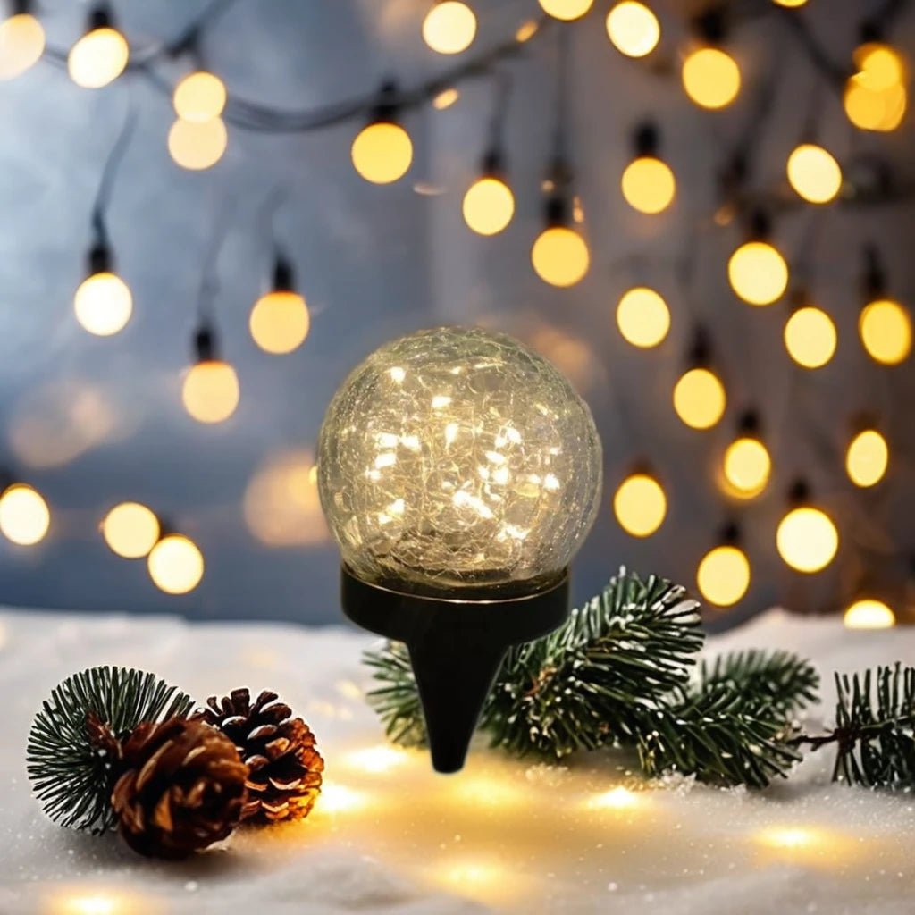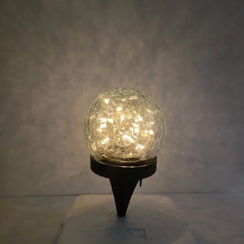 This Solar Powered Glass Ball Light features a sophisticated crackle-glass design, providing an inviting, warm glow for any outdoor setting. The decorative globe encloses high-quality copper wire fairy lights with warm white LEDs (3000K), creating a soft ambient atmosphere for gardens, patios, or pathways. Built with IP65-rated waterproof technology, this durable fixture is designed to withstand various weather conditions. It operates entirely on renewable solar energy, utilizing automatic light-sensing technology to charge during the day and activate at night. This provides an elegant and sustainable lighting solution suitable for daily decor and special occasions.