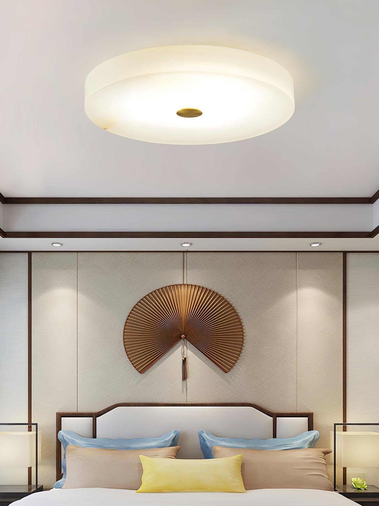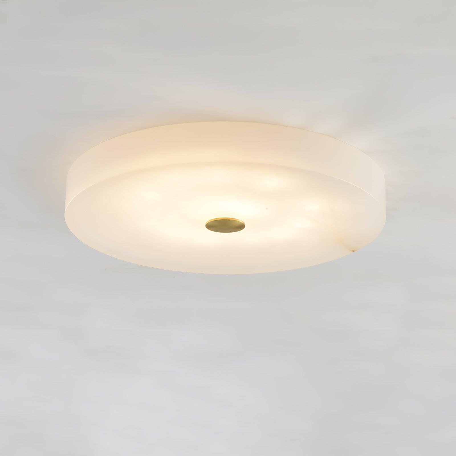 The Sophie Alabaster Ceiling Lamp features a round design crafted from genuine Alabaster and Metal. This fixture provides ambient lighting, enhancing contemporary interiors.