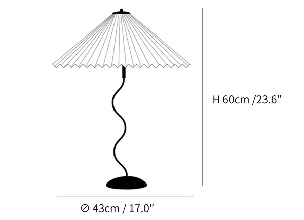 The MINIHOUZZ Origami Squiggle Table Lamp is a lighting fixture designed with Nordic and modern aesthetics. It features a pleated lampshade, made from fabric and plastic, and is supported by a distinctive curved, wavy metal stem. The lamp’s base design provides diffused illumination, contributing to a pleasant and cozy atmosphere.