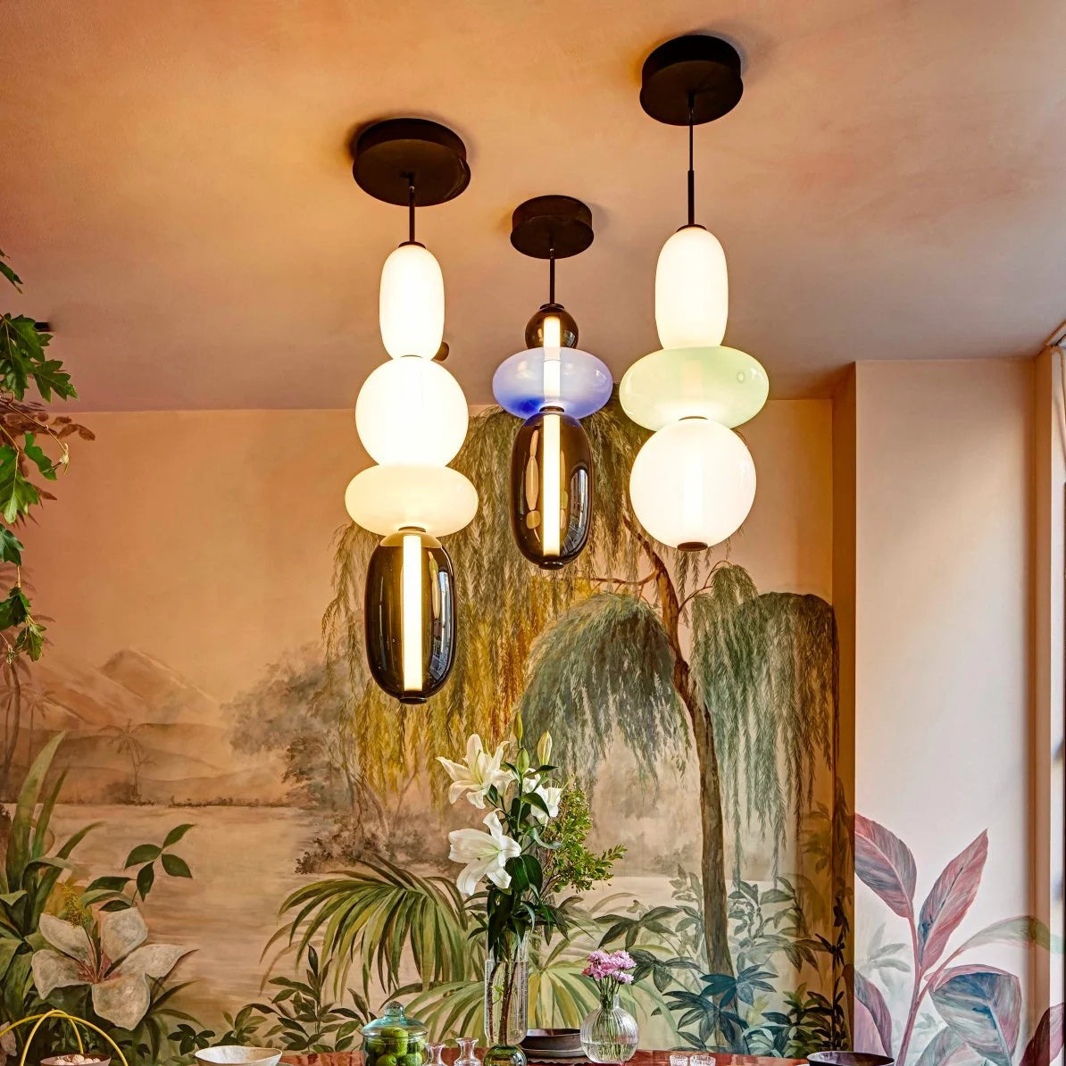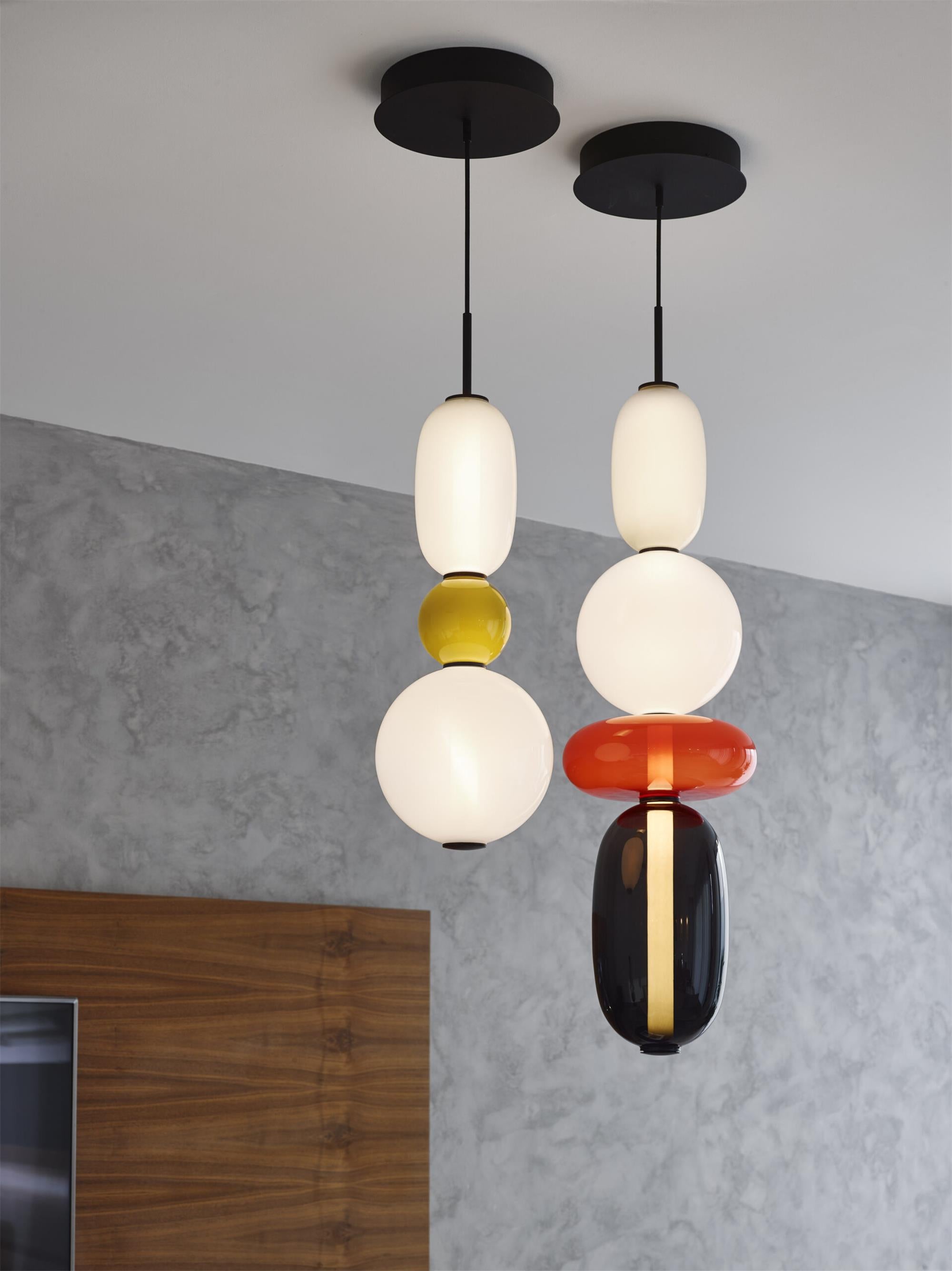 Explore the versatility of this hand-blown glass lighting fixture. Each unique glass component allows for a personalized and artistic arrangement. With a variety of vibrant colors and shapes, you can create a sophisticated and elegant chandelier tailored to your interior design.