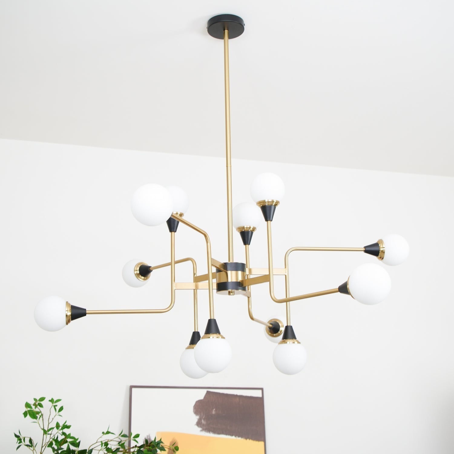 This chandelier features an asymmetrical design, composed of six bent brass arms with black enamel details. It is adorned with 12 blown white glass globes, offering a striking aesthetic.
