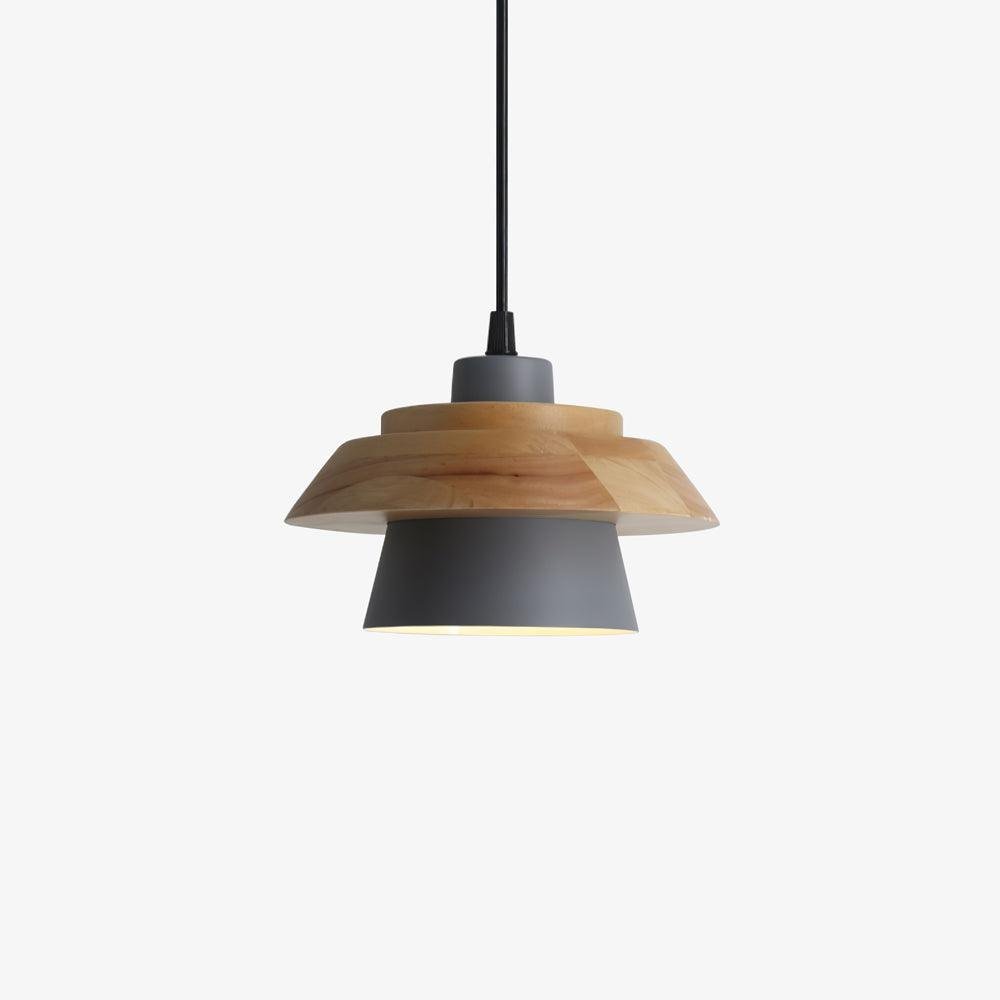 This Nordic-style pendant light features a combination of metal and wood, presenting a modern aesthetic. It is suitable for illuminating areas such as kitchen counters or dining room tables. The design incorporates a natural wood structure with a matt-finished metallic lampshade. An adjustable cable allows for customization of the hanging height.