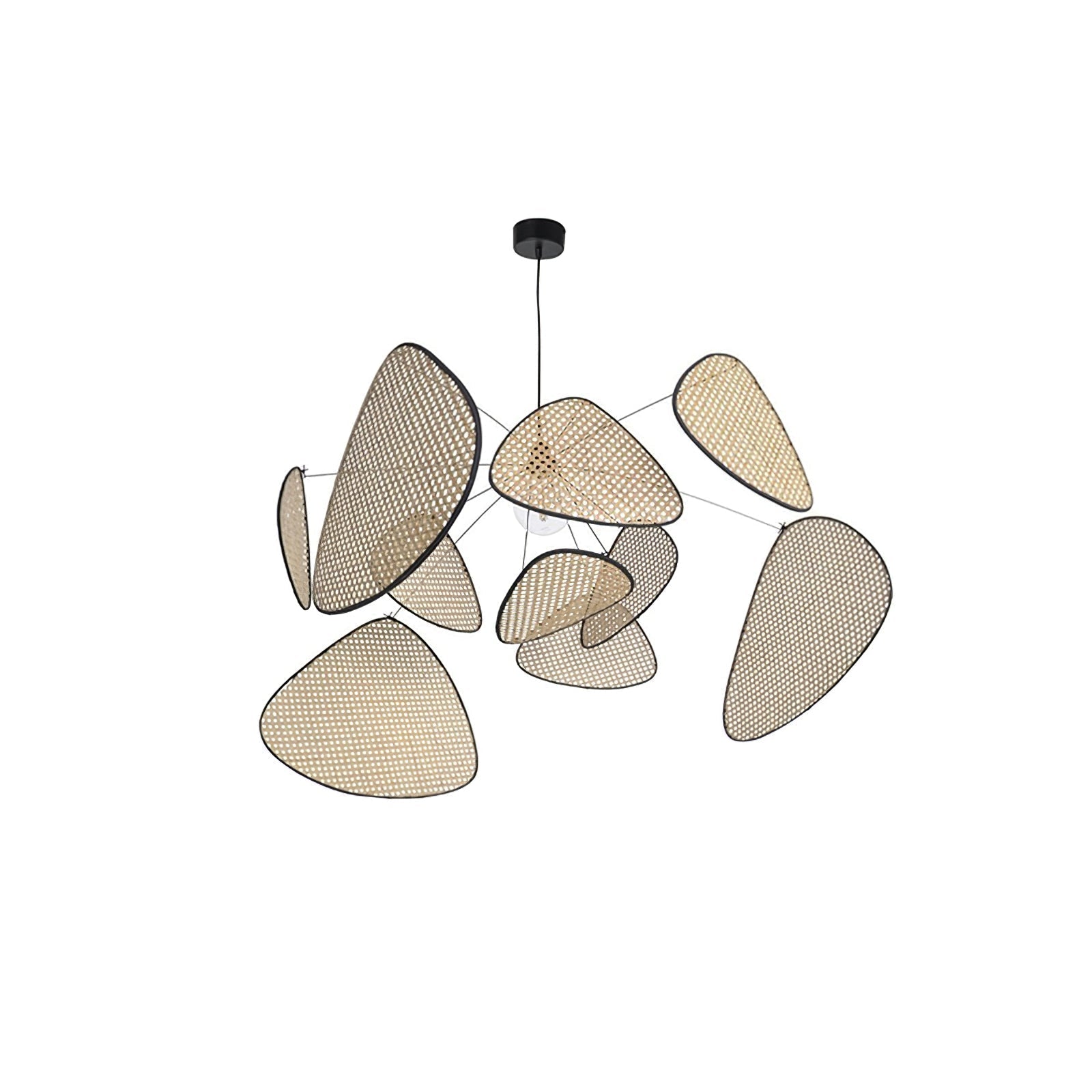 The light and airy Suspension Screen showcases a blend of technology and material selection. In an industrial aesthetic, its 10 rattan curtains are adorned with fabric edges. This suspension light emits a warm, open glow, enhancing interior decoration with a distinctive retro and design appeal.