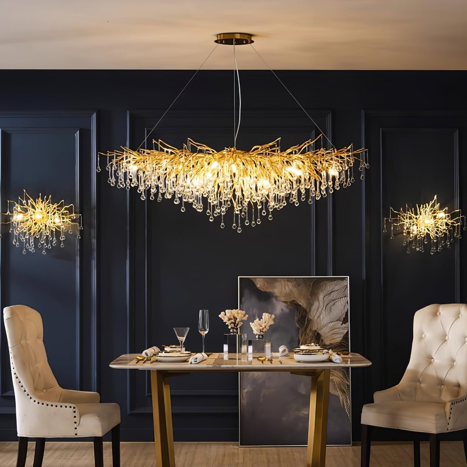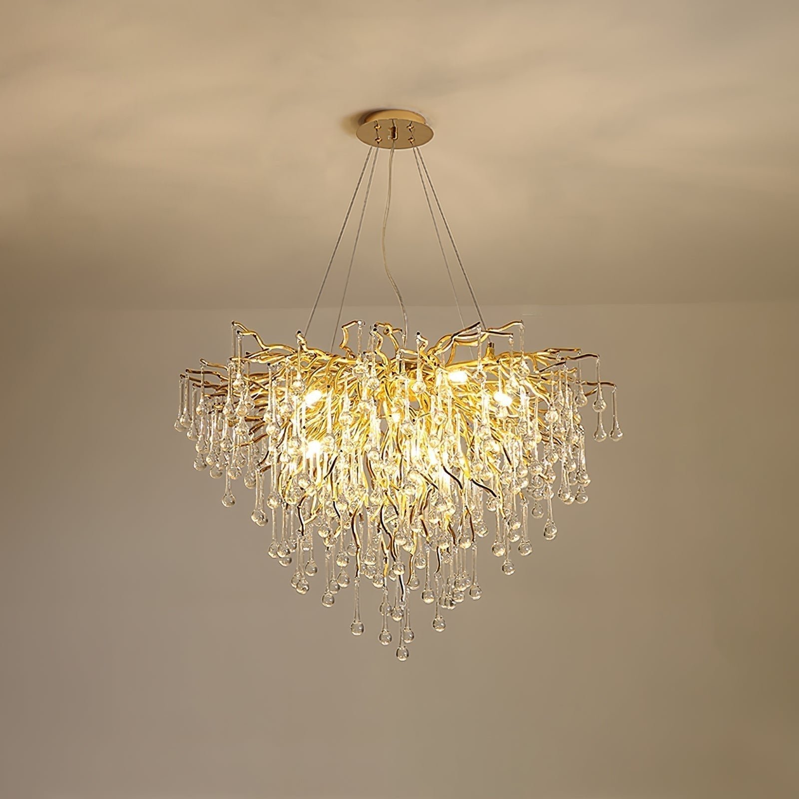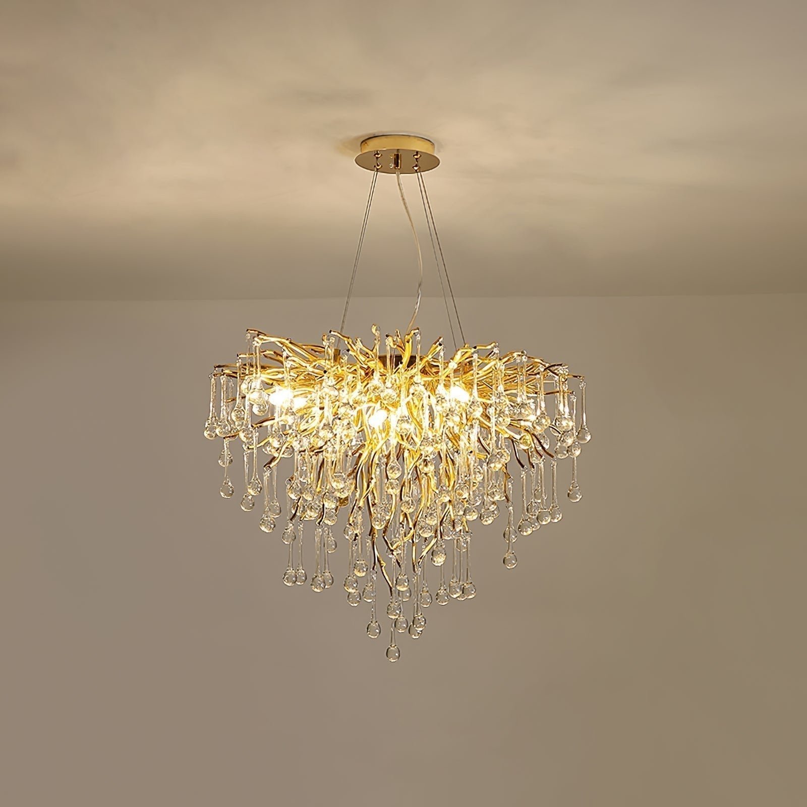 The MINIHOUZZ Teardrop Crystal Chandelier features crystal teardrop beads that create a captivating sparkle. This elegant fixture is designed to enhance the aesthetic of various indoor spaces with its sophisticated design.