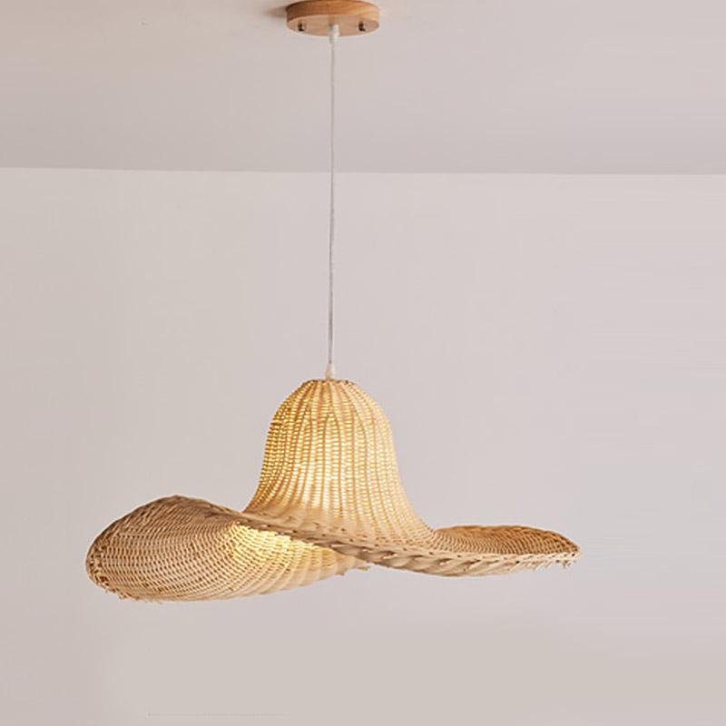 The Minihouzz hat-shaped rattan pendant light offers a rustic aesthetic. Crafted from natural rattan, this pendant light serves as an adaptable fixture for various living spaces. It is suitable for integration into both traditionally furnished and modern interiors, making it an ideal choice for living rooms, bedrooms, or hallways.