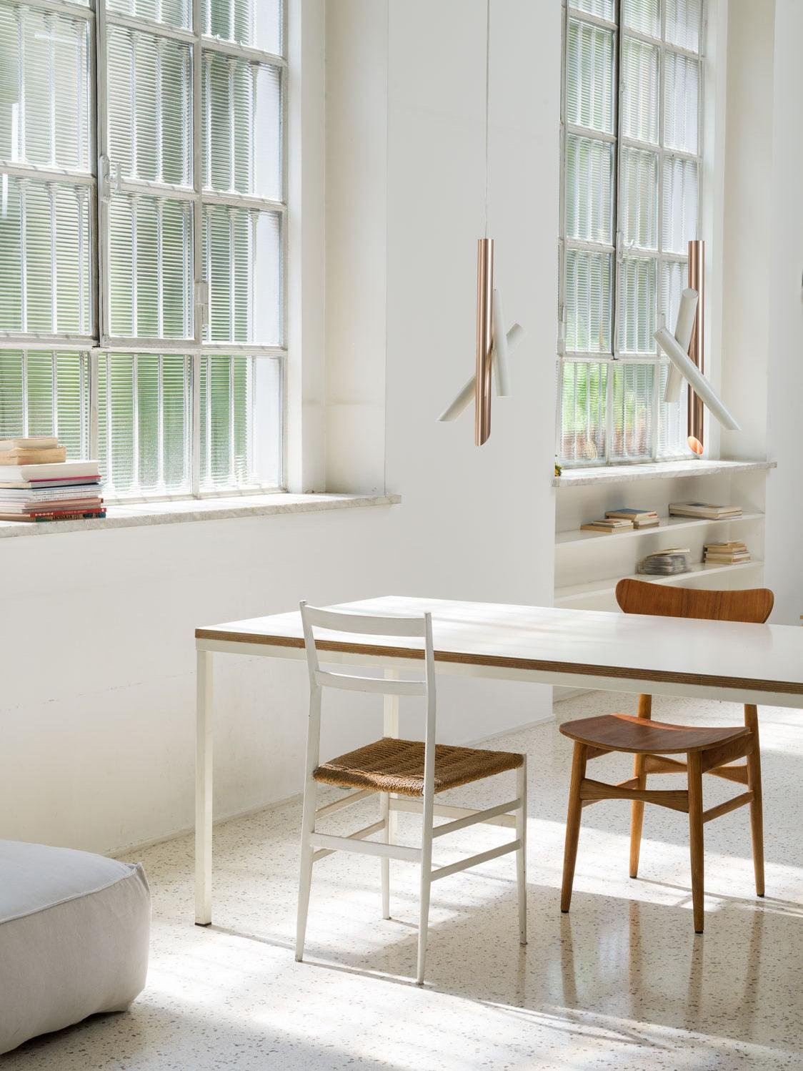 This product is made with tubular elements, featuring a strong and essential design expressed through pure forms. The Tube 2 is a pendant lamp composed of two cylindrical elements in extruded aluminum, equipped with a white polycarbonate lens for a diffused, uniform light.